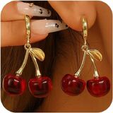 • Cute Red Cherry Fruit Earrings for Women Dainty, Statement Gold Leaf Cherries Drop Dangly Hoop Earring Charm Aesthetic Minimalist Party Jewelry Gift