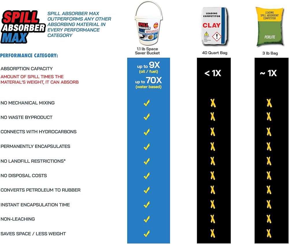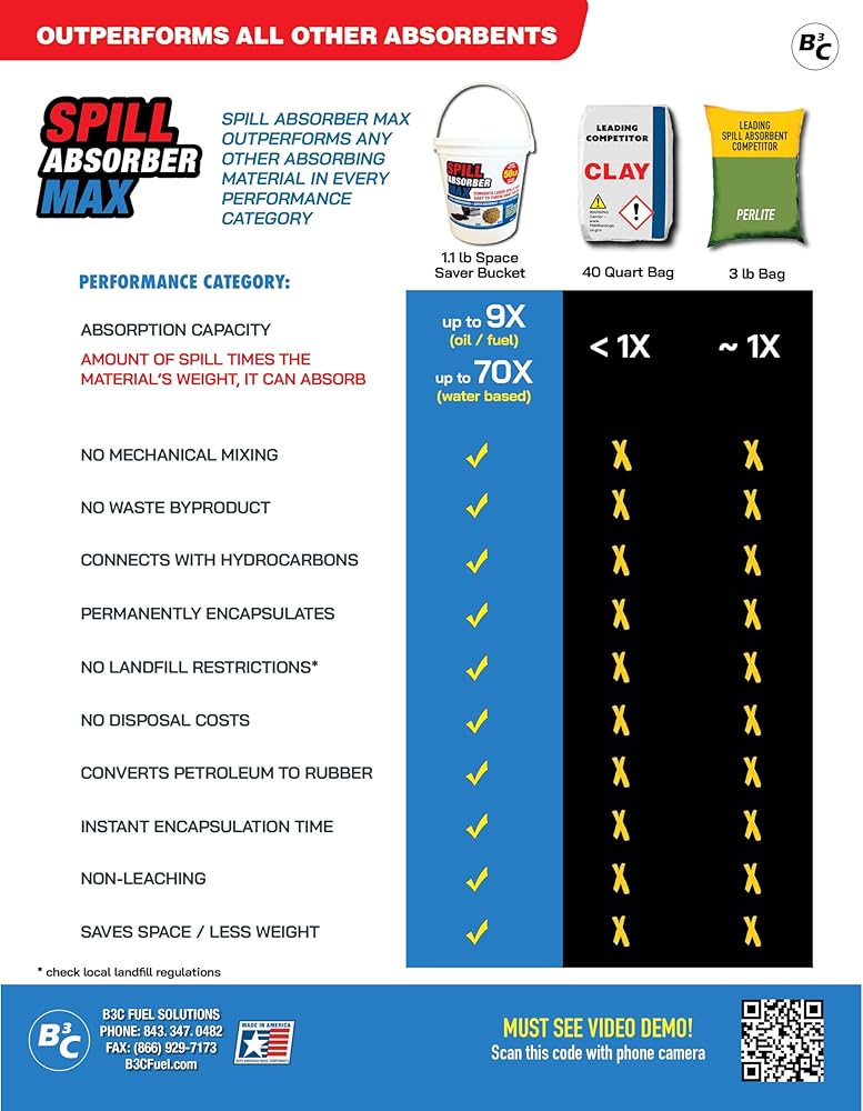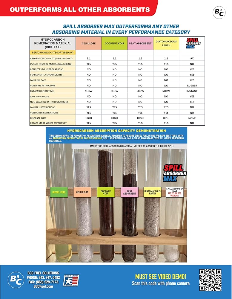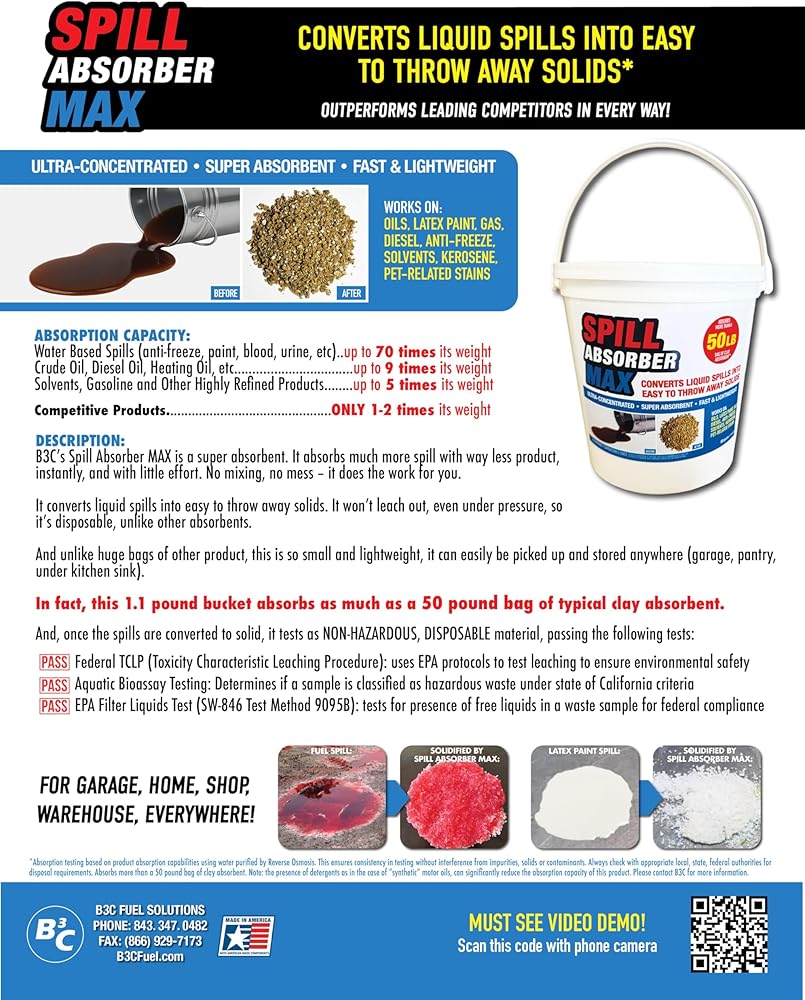 B3C's Spill Absorber Max is the World's most efficient SUPER absorbent, outperforming all other absorbents in every way. There's nothing else like it on the market. It instantly absorbs latex paint, anti-freeze, diesel fuel, motor oil, kerosene, solvents and all the pet related stains. It requires much less than other products. Like 20 times less for the same spill. In fact, our 1.1 POUND BUCKET absorbs as much as a 50 POUND BAG OF CLAY ABSORBENT! It's that efficient, so it's super light and saves a ton of storage space. It's instant – there's less mixing than other absorbents. And when it touches the spill, it converts it into a solid – either a plastic or rubber. And that solid holds the spill permanently. It can't leach out, so it's disposable or you can just burn it. Try that with other absorbents. Use it anywhere you have spills. It's the fastest, easiest, most effective way to get rid of spills. Spill Absorber Max. Absorb More. Use less. Less Mess. * Check with appropriate local, state, federal authorities for disposal requirements.