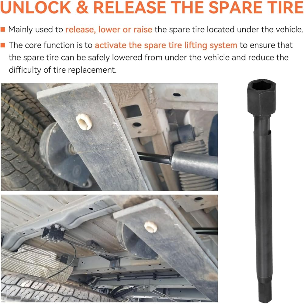• 【Unlock and Release The Spare Tire】For dod'ge ram spare tire wrench as a manual tool or device, is primarily used to release, lower, or raise the spare tire located beneath the vehicle. Its core function is to activate the spare tire lifting system, ensuring the spare tire can be safely and reliably lowered from beneath the vehicle under any circumstances, thereby reducing the difficulty and risk factors associated with tire changes.