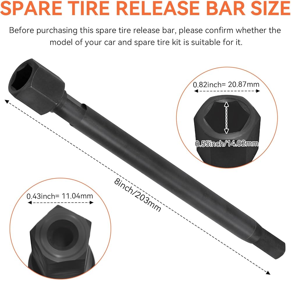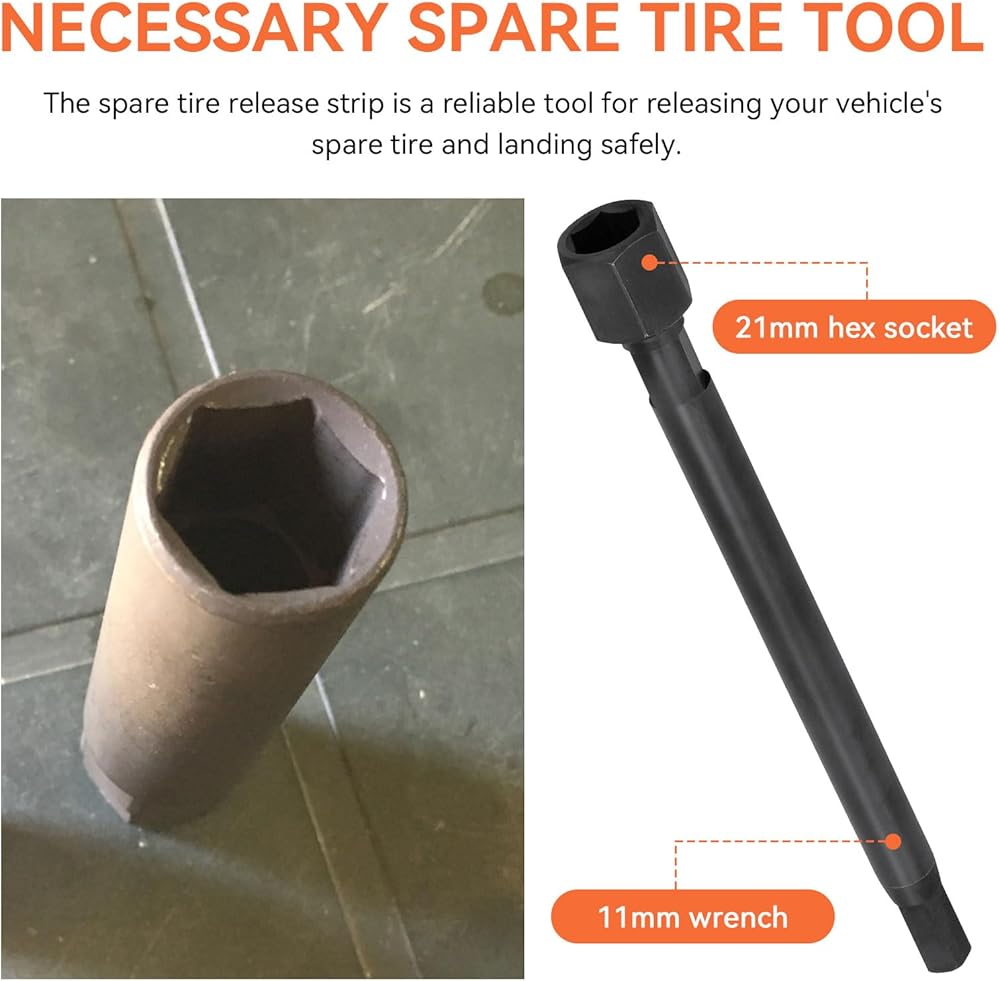• 【Spare Tire Release Bar Size】Included 1 x Spare tire release tool. For dod'ge ram spare tire tool total length: 8 inches, hex head diameter: 0.82 inches, release bar pentagon head diameter: 0.43 inches. The hex diameter of this spare tire winch tool is 0.82 inches, allowing for use with either a 21mm hex socket or an 11mm wrench.