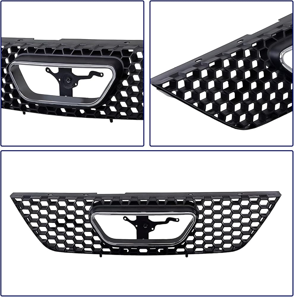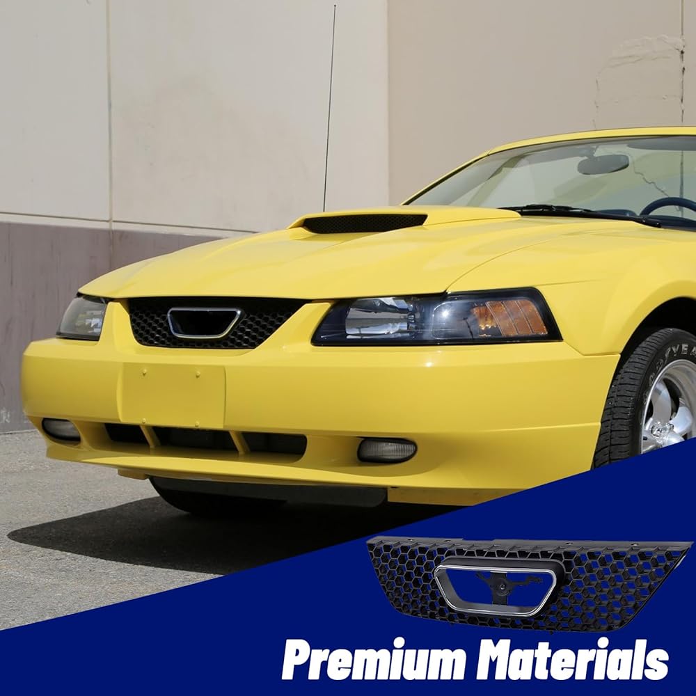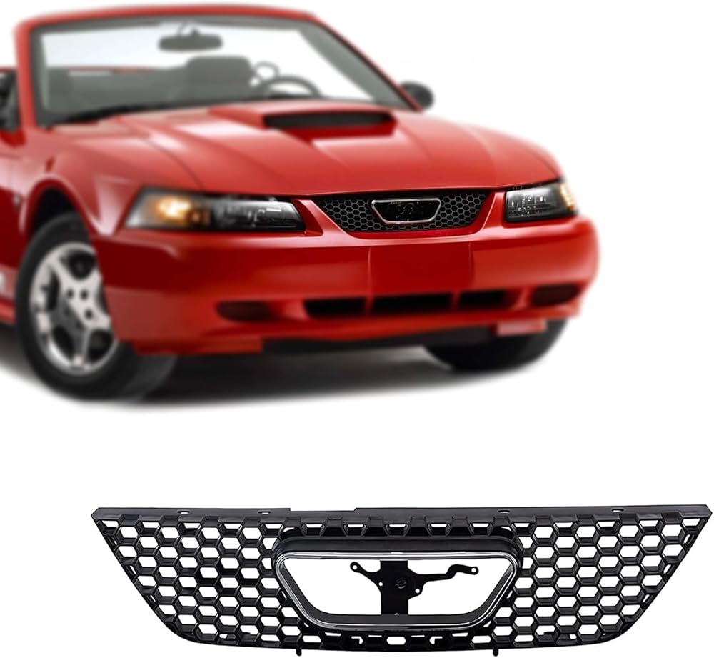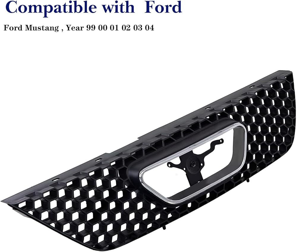قطع غيار مجموعة شبكة الشبكة الأمامية مع غلاف أسود وإدراج مع زخرفة قولبة لفتح شعار الكروم متوافقة مع Ford Mustang 1999 2000 2001 2002 2003 2004