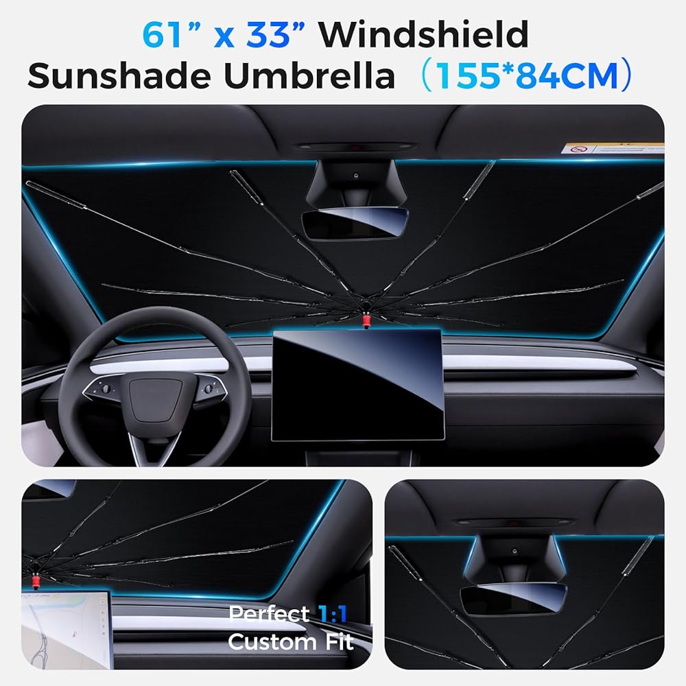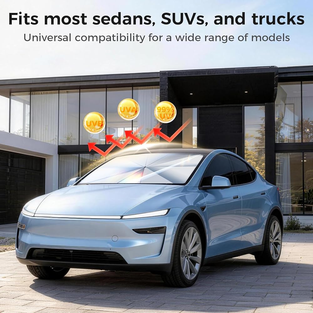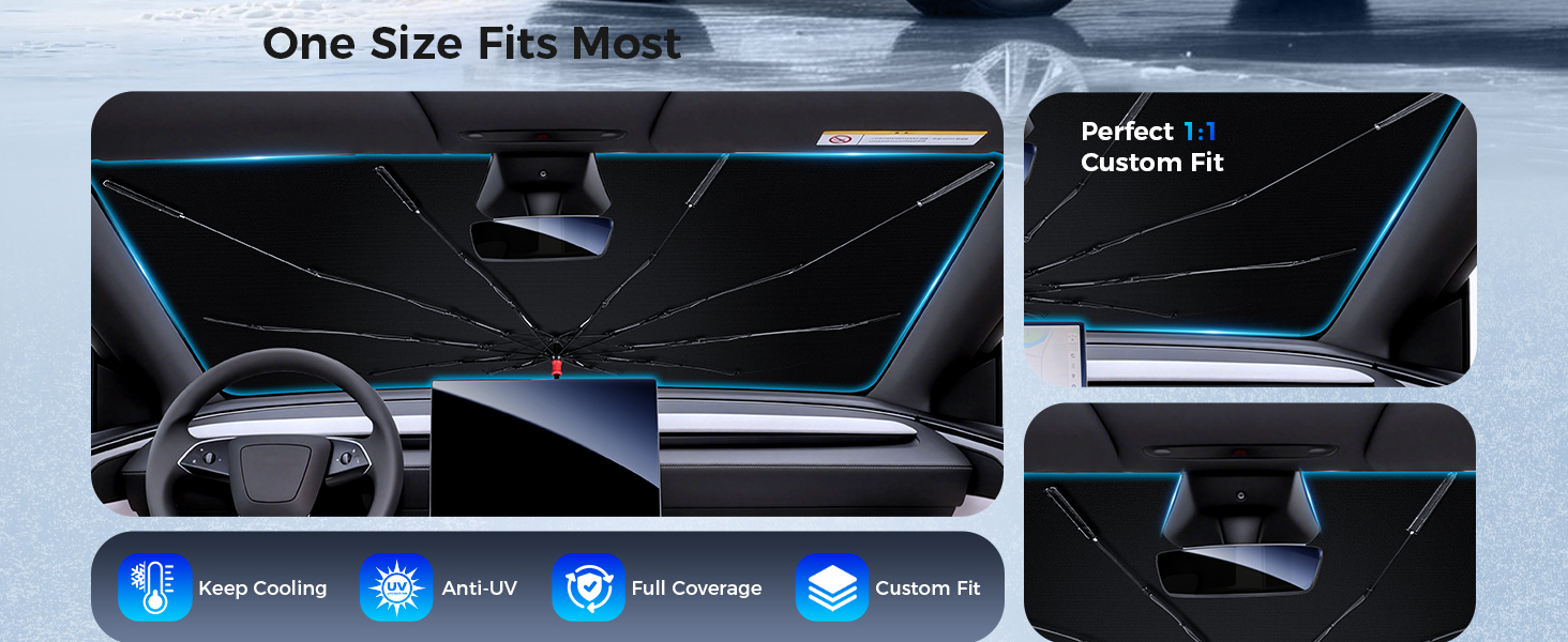 ملاءمة عالمية لمعظم المركبات: تم تصميم المظلة الشمسية للزجاج الأمامي لتناسب الزجاج الأمامي لمعظم سيارات السيدان وسيارات الدفع الرباعي والشاحنات. توفر المظلة المرنة تغطية واسعة للحماية الفعالة من أشعة الشمس، مما يجعلها حلاً عمليًا لمظلة الشمس للقيادة اليومية ومواقف السيارات