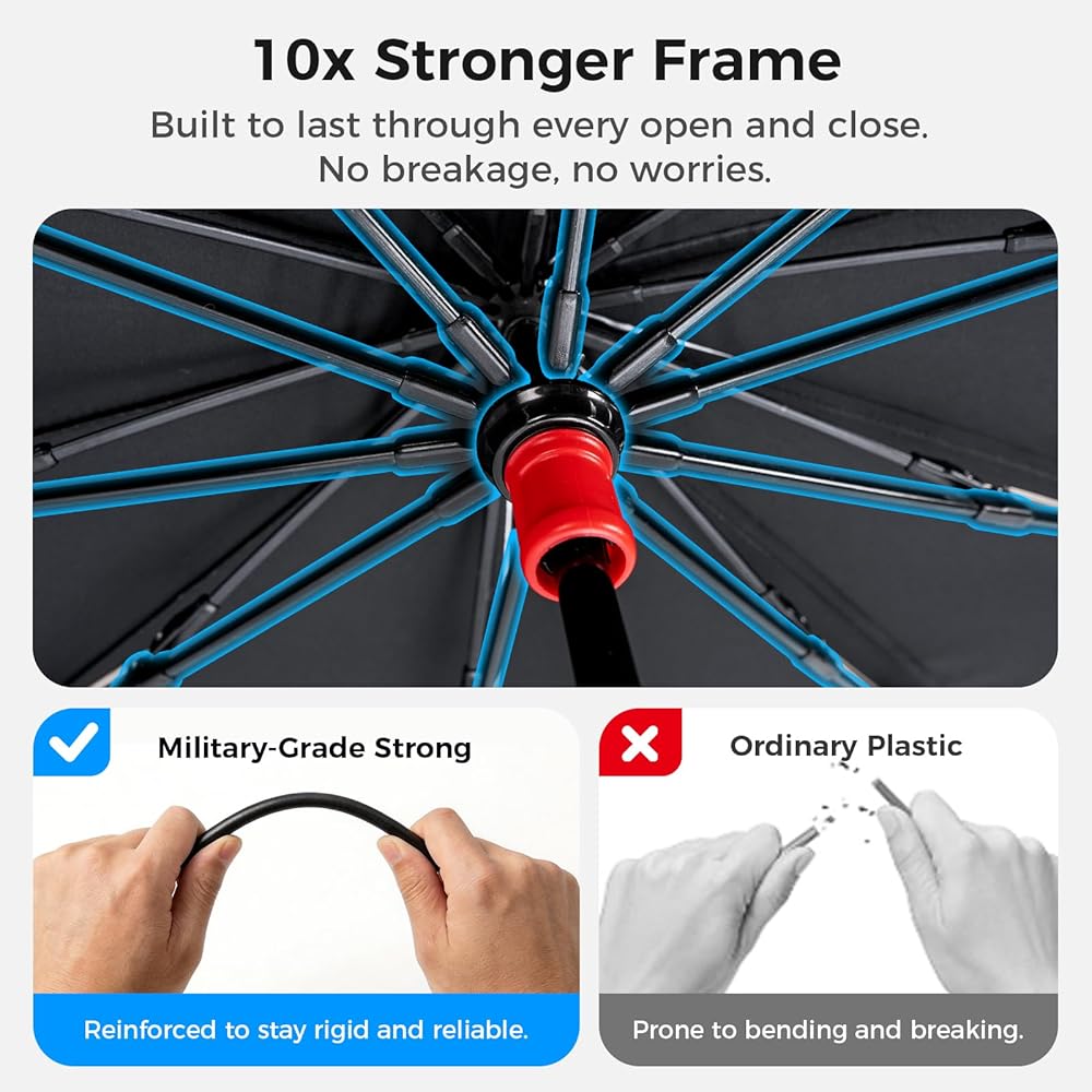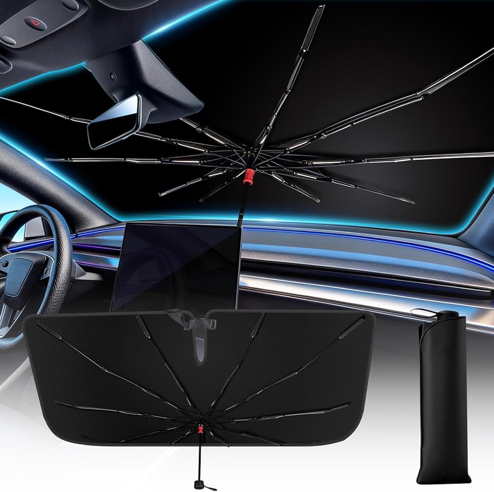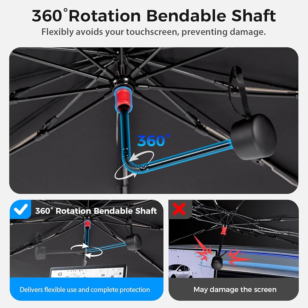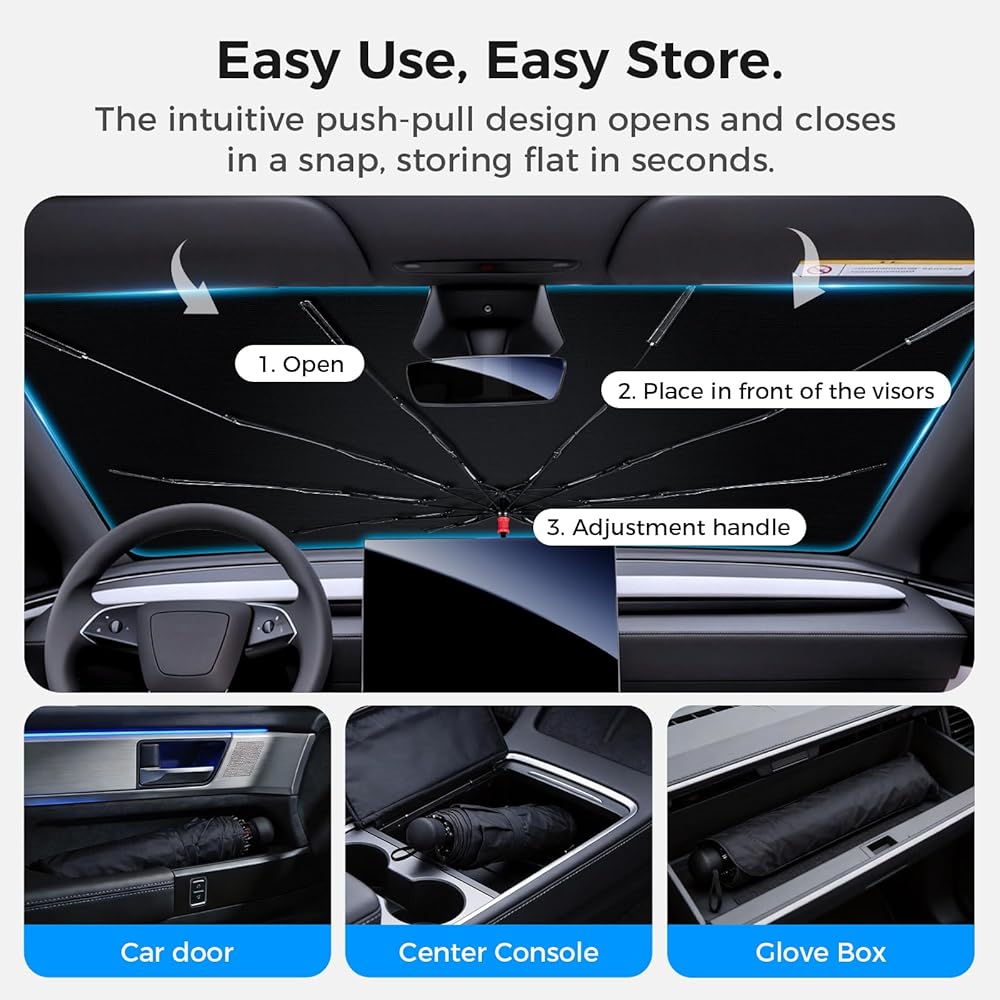 تركيب سهل في ثانية واحدة: تفتح مظلة الشمس للزجاج الأمامي للسيارة وتغلق تمامًا مثل المظلة العادية، مما يسمح لك بتركيبها أو إزالتها في ثوانٍ. ما عليك سوى فتح مظلة الشمس ووضعها على الزجاج الأمامي ثم طيها مرة أخرى للتخزين السريع عند عدم الاستخدام.
