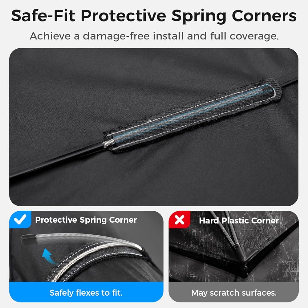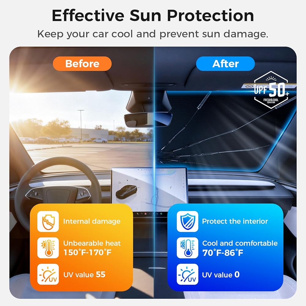حماية قوية من الأشعة فوق البنفسجية وتقليل الحرارة: تستخدم مظلة الشمس للزجاج الأمامي نسيجًا عاكسًا عالي الكثافة لمنع الأشعة فوق البنفسجية الضارة وتقليل تراكم الحرارة داخل سيارتك. من خلال حماية لوحة القيادة وعجلة القيادة والمقاعد من أشعة الشمس المباشرة، فإنه يساعد على منع البهتان والتشقق والأضرار الداخلية مع الحفاظ على برودة سيارتك بشكل ملحوظ في الأيام الحارة.