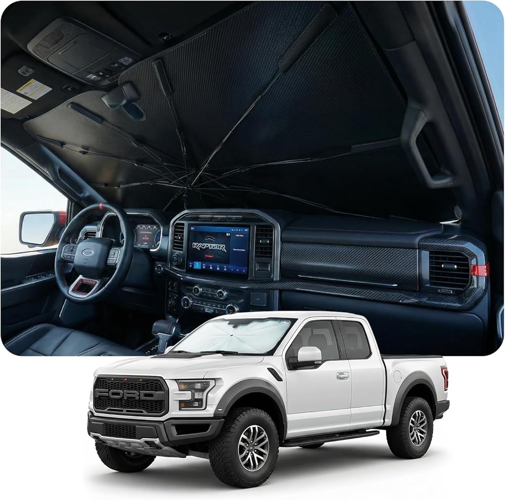 【مناسب تمامًا لسيارة Ford F150 2015-2026】مظلة شمسية للزجاج الأمامي للسيارة مصممة خصيصًا لسيارة Ford F150 2015,2016,2017,2018,2019,2020,2021,2022,2023,2024,2025,2026، توفر تغطية كاملة كظل شمس يمكن الاعتماد عليه للسيارة الزجاج الأمامي.