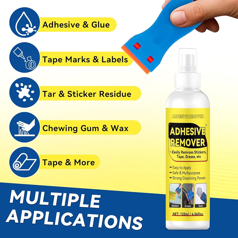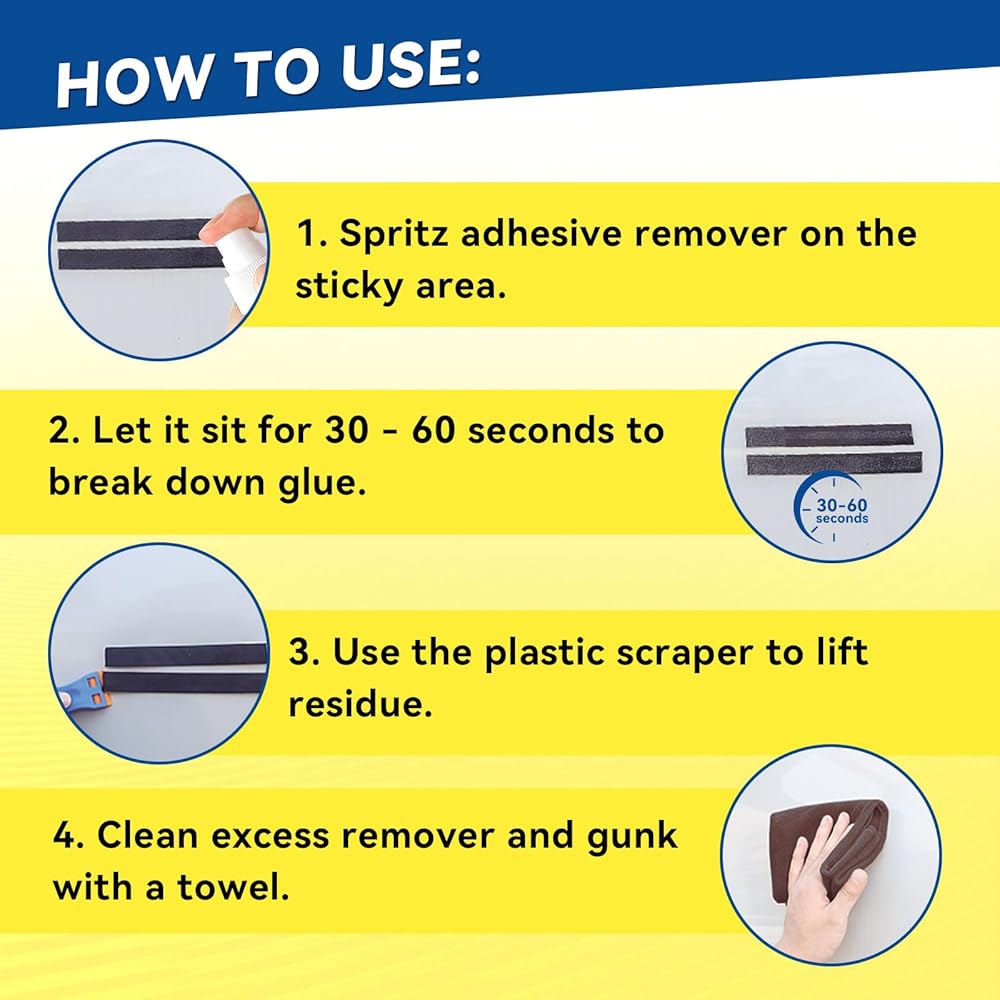سهل الاستخدام: يتم تعبئة مزيل اللاصق السريع الخاص بنا في زجاجة سهلة الرش مع فوهة مدمجة، وهي جاهزة للاستخدام. ما عليك سوى الرش ثم استخدام المكشطة المرفقة لإزالة المادة اللاصقة المتبقية