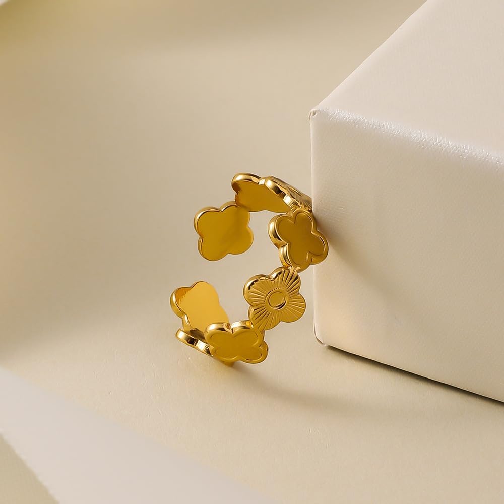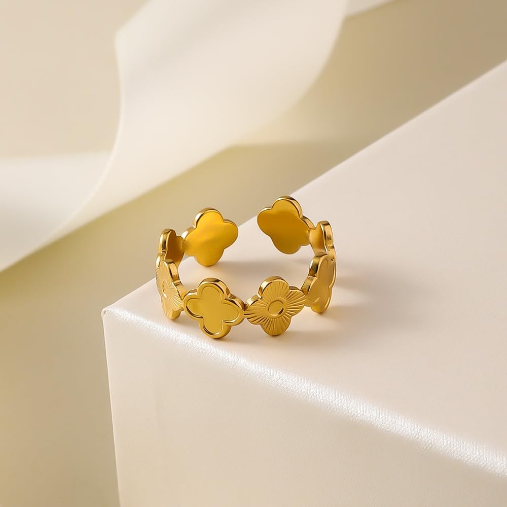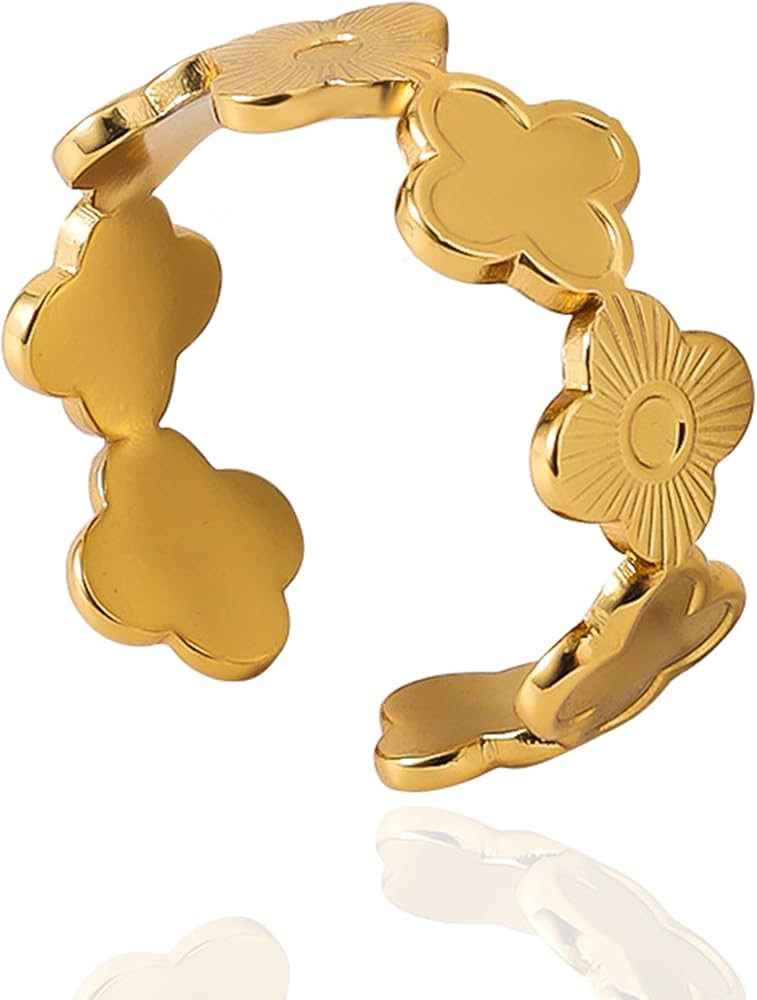 Add a touch of enchantment to your jewelry collection with this charming four-leaf clover ring. Crafted with hypoallergenic gold plating, this delicate piece combines style with comfort for everyday wear. The adjustable design ensures a perfect fit for various finger sizes, making it an ideal accessory for any occasion. The classic four-leaf clover symbolizes good fortune and features a polished finish that catches the light beautifully. This versatile ring can be worn alone as a subtle statement piece or stacked with other rings for a more dramatic look. The durable gold plating maintains its luster while being gentle on sensitive skin. Whether you're treating yourself or searching for a thoughtful gift, this lucky charm ring adds a meaningful sparkle to any jewelry box.