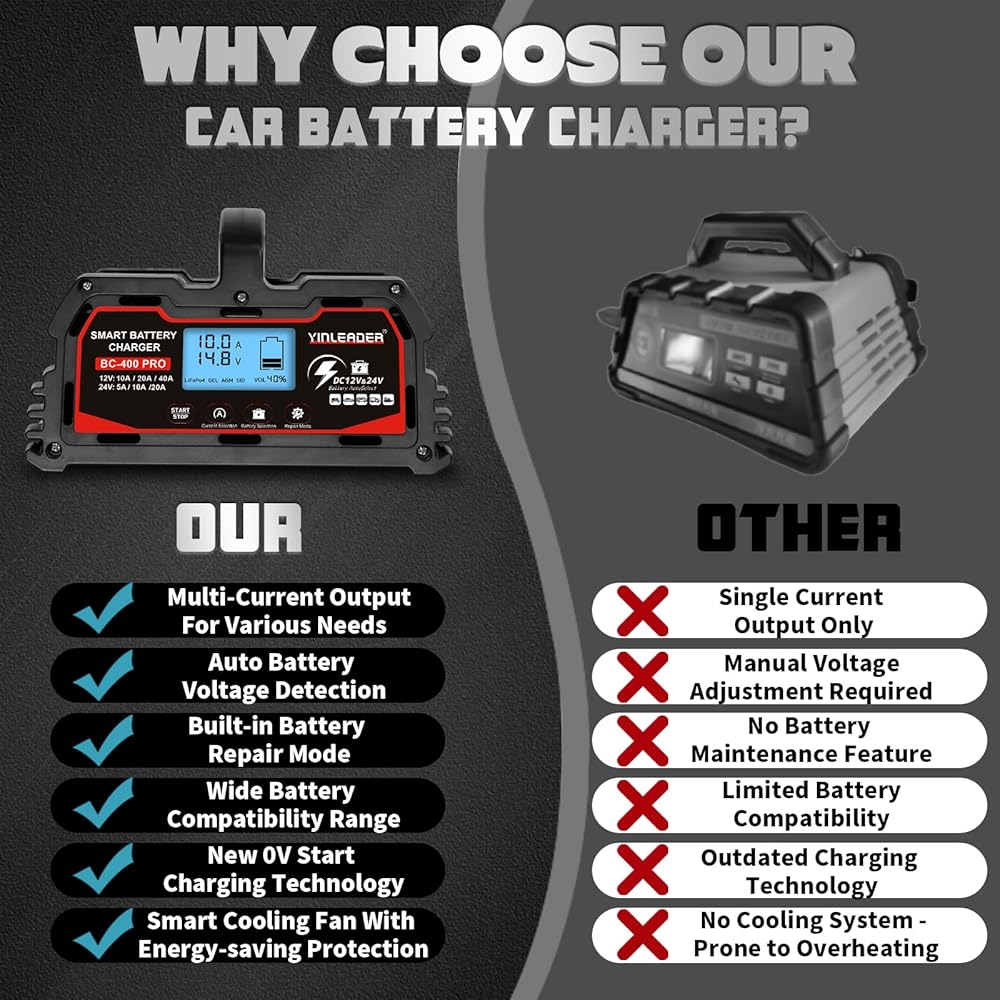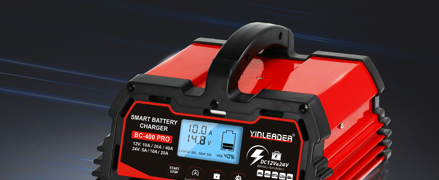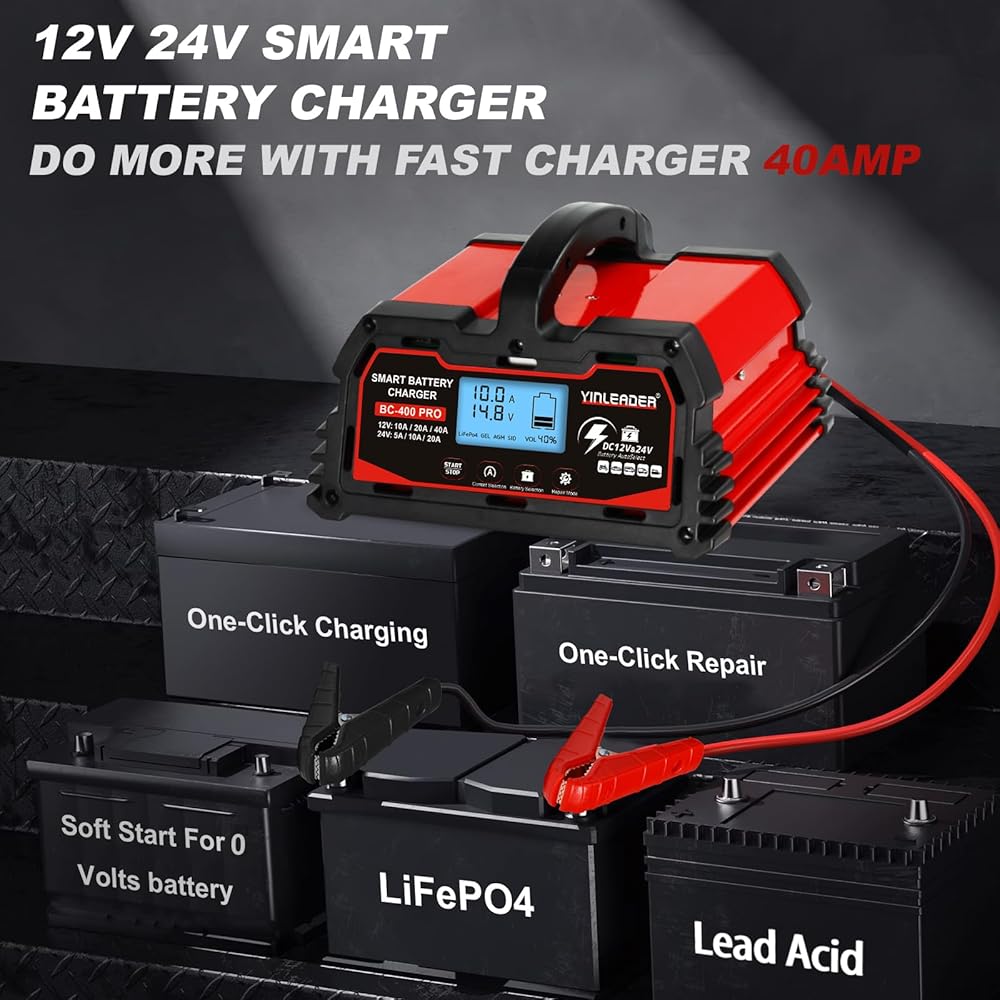 • مجموعة واسعة من التطبيقات: يوفر تيار شحن متغير (12V-10A/20A/40A)/(24V-5A/10A/20A) وشحن بطارية 12V-LifePO4، مما يسمح لك باختيار التيار المناسب لحجم البطارية. مناسبة لشحن وإصلاح بطاريات الرصاص الحمضية، بما في ذلك AGM وSTD وGEL وSLA وما إلى ذلك، في السيارات والشاحنات وسيارات الدفع الرباعي والدراجات النارية وجزازات العشب والقوارب والمزيد.
