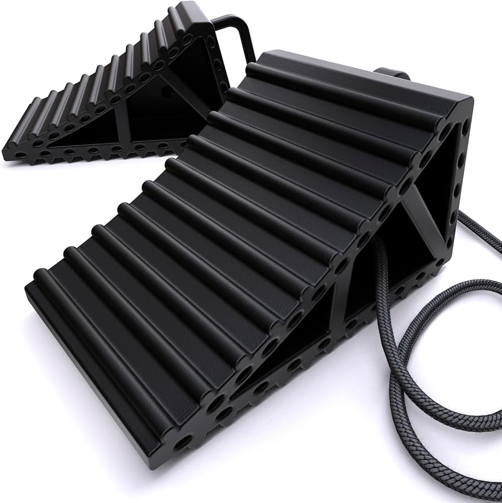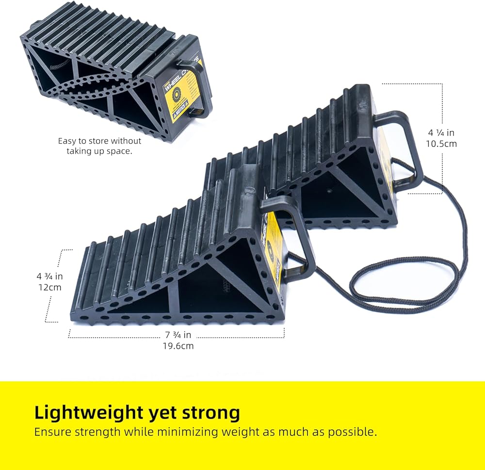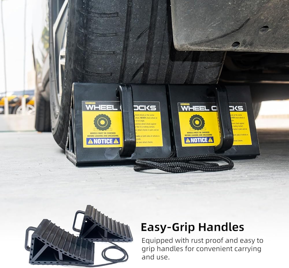 Easy-Grip Handles & Convenient Connectors: Equipped with rust-resistant, easy-to-grip handles for convenient use and transportation, along with the ability to pair chocks together with ropes for added stability and easy storage.