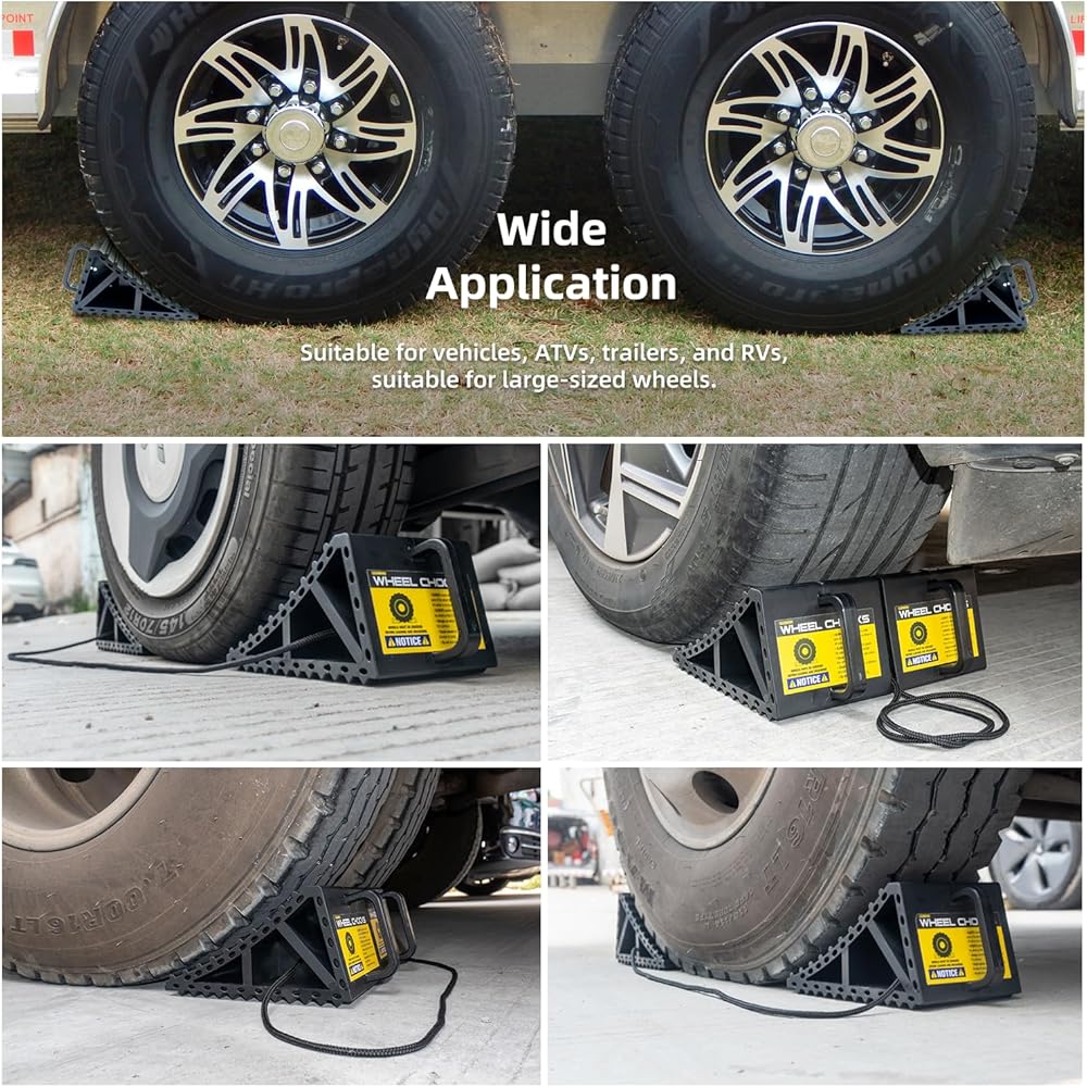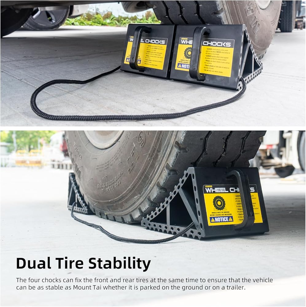 Dual Tire Stability: Four chocks secure both the front and rear tires at once, ensuring your vehicle stays firmly in place whether parked on the ground or on a trailer.