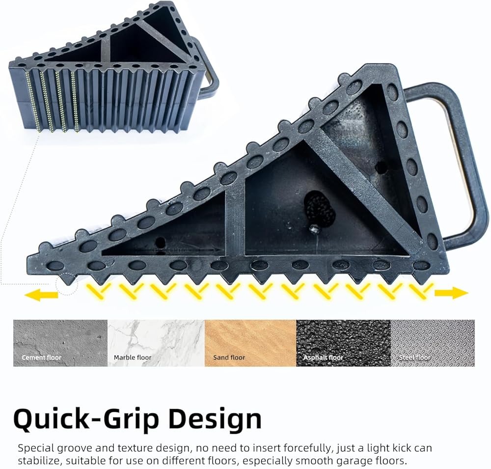 Quick-Grip Design: Aggressive grooves and a textured bottom ensure a secure grip with a simple kick, even on smooth surfaces like garage floors.