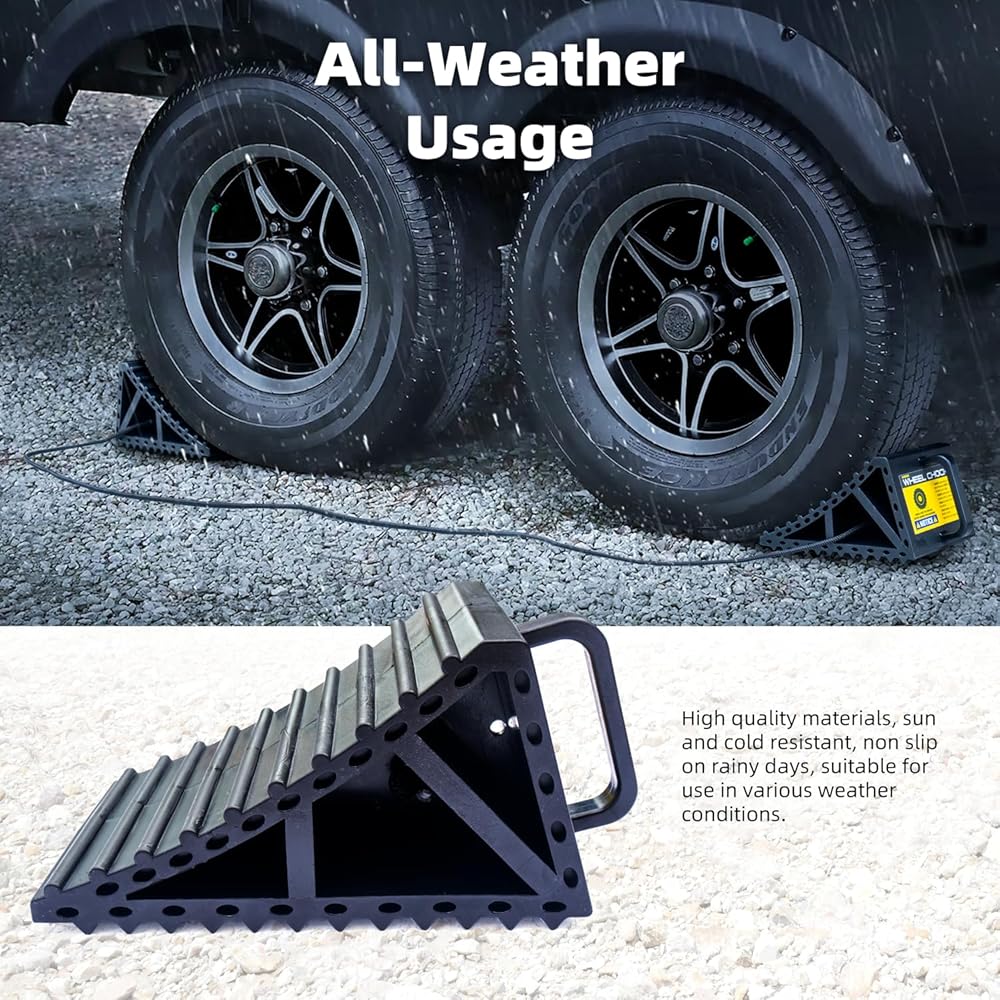 All-Weather Usage: These wheel chocks are built to withstand harsh weather conditions, including dirt, salt, ice, mud, sun, sand, and heat, ensuring reliable performance in any environment.