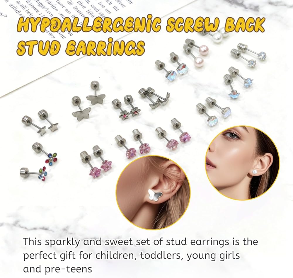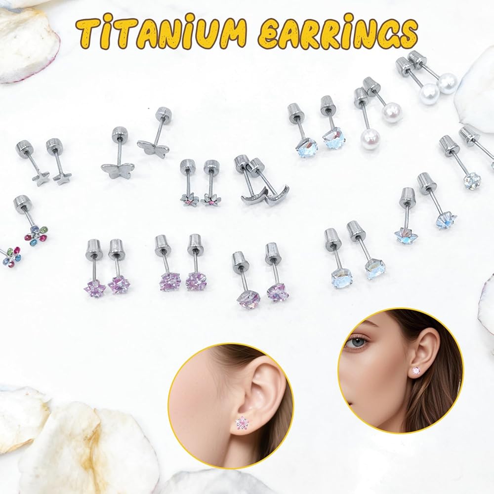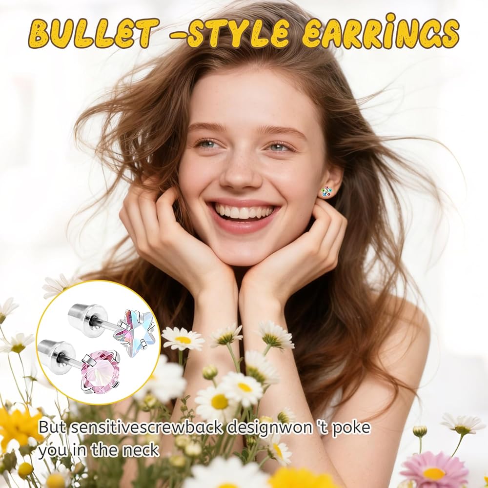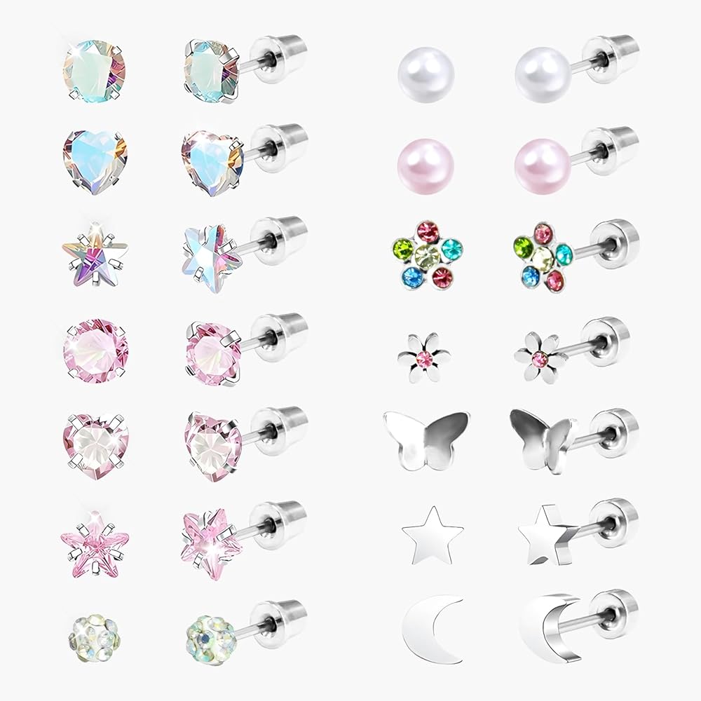 14 Pairs Hypoallergenic Screw Back Earrings for Women 316L Stainless Steel CZ Ball Heart Flower Star Moon Screwback Flat Back Stud Earrings Jewelry Gift Multicolored