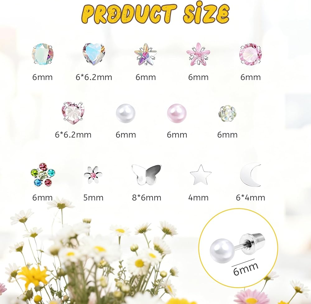 1. 【Comprehensive 14-Pair Set】 Discover our exquisite collection of 14 pairs of hypoallergenic stud earrings. Featuring a charming variety of designs including sparkling CZ balls, elegant simulated pearls, lovely hearts, chic stars, and delicate flowers, this set offers endless possibilities to accessorize for any occasion, giving you a glamorous look every day.