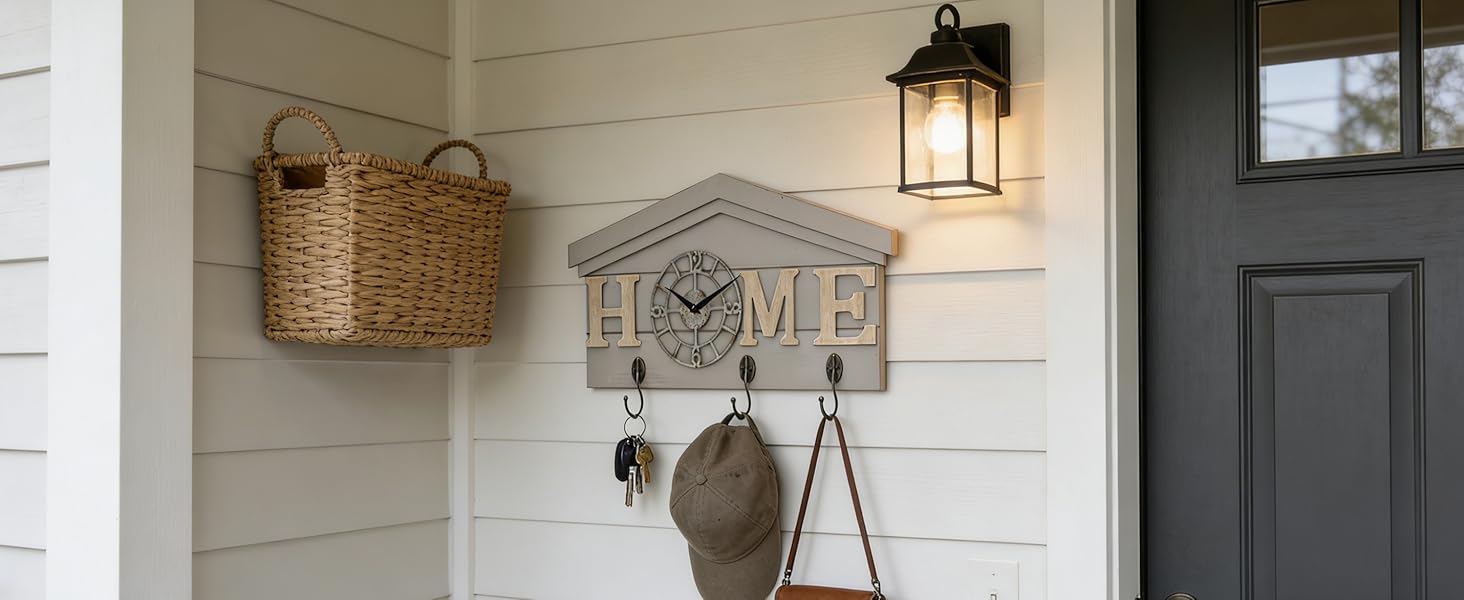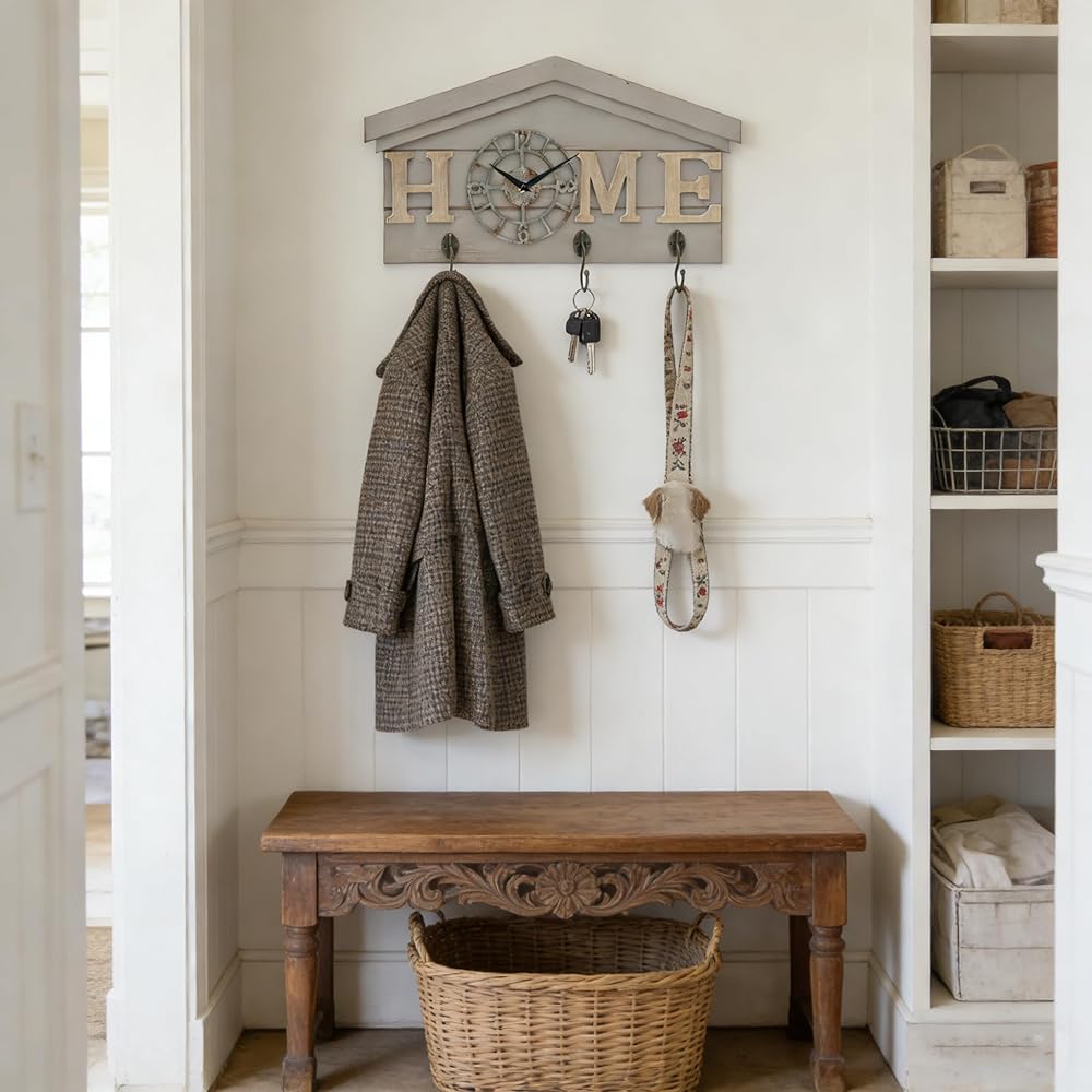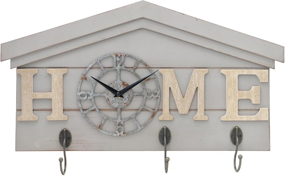 تصميم عملي 3 في 1 تجمع ساعة الحائط هذه بين الساعة وديكور الحائط وحل التخزين في آن واحد. مثالي كمنظم للمدخل، فهو يساعد على الحفاظ على منزلك مرتبًا مع إضافة سحر بيت المزرعة الريفي.