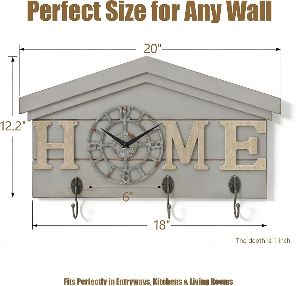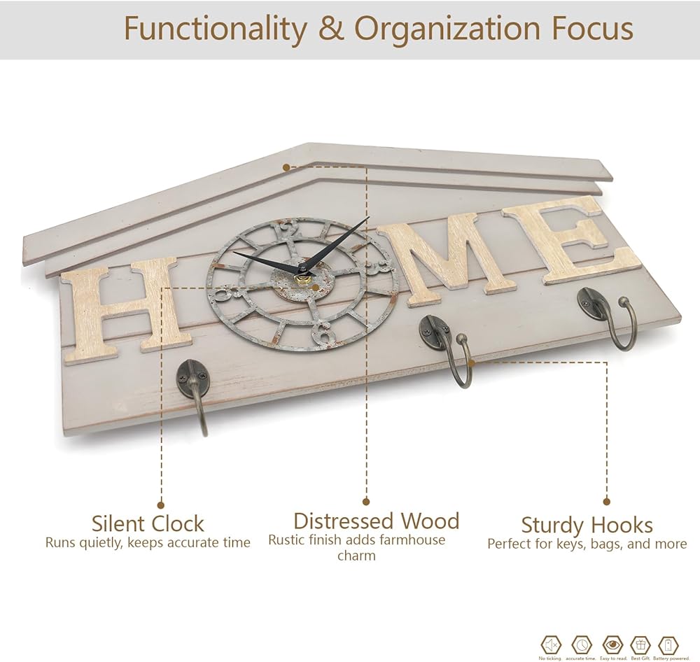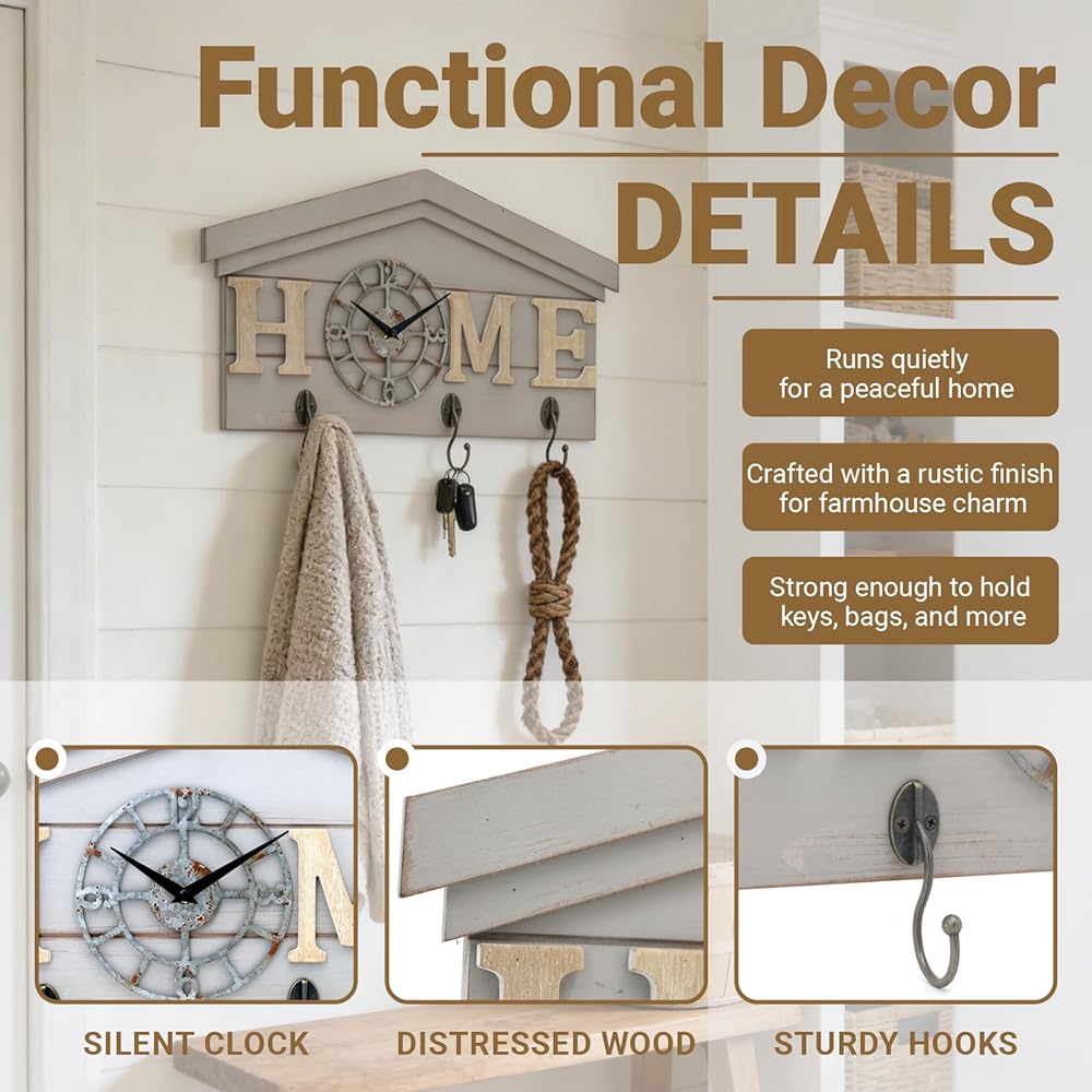 ساعة حائط تعمل بالبطارية في المزرعة مع خطافات منظم مدخل خشبي ريفي مع 3 خطافات معدنية شماعة مفاتيح وحروف منزلية ساعة كوارتز صامتة حامل مفاتيح ديكور حائط لمدخل المطبخ وغرفة المعيشة