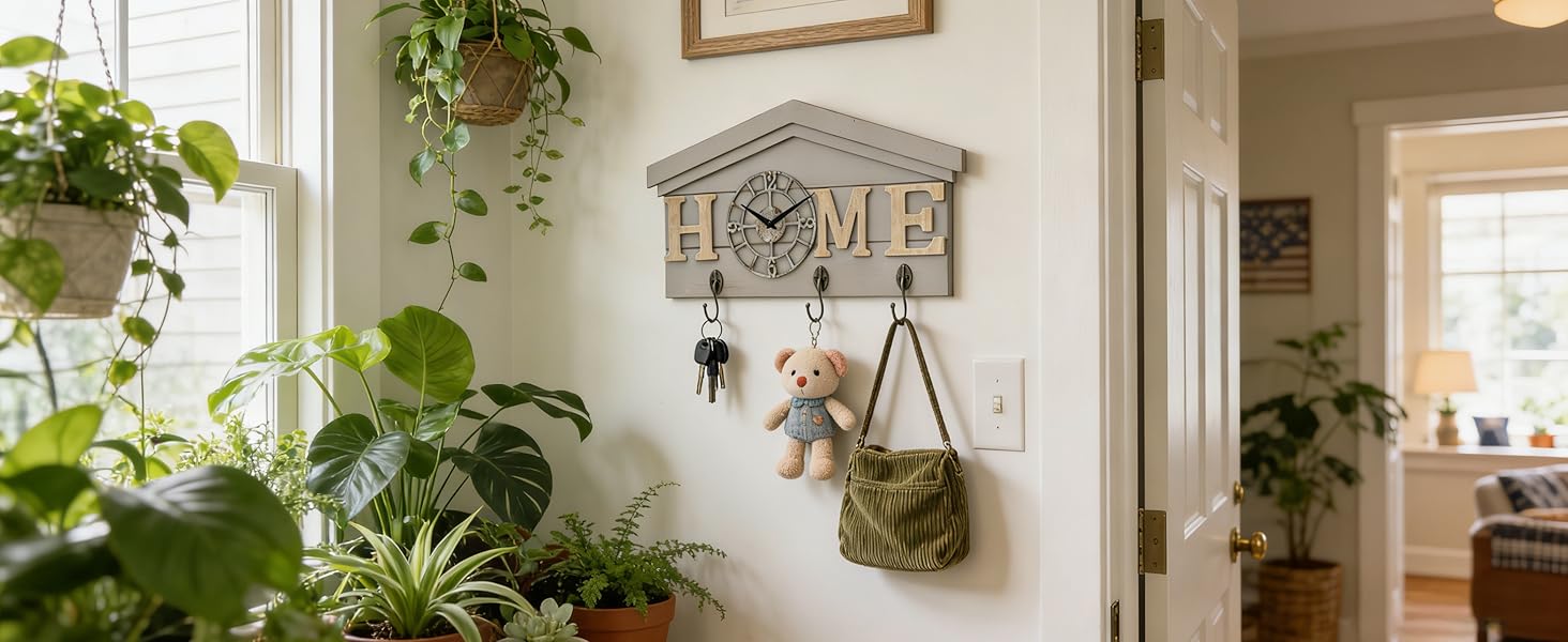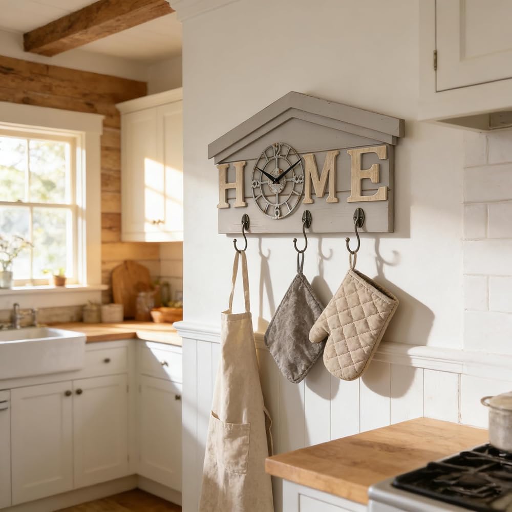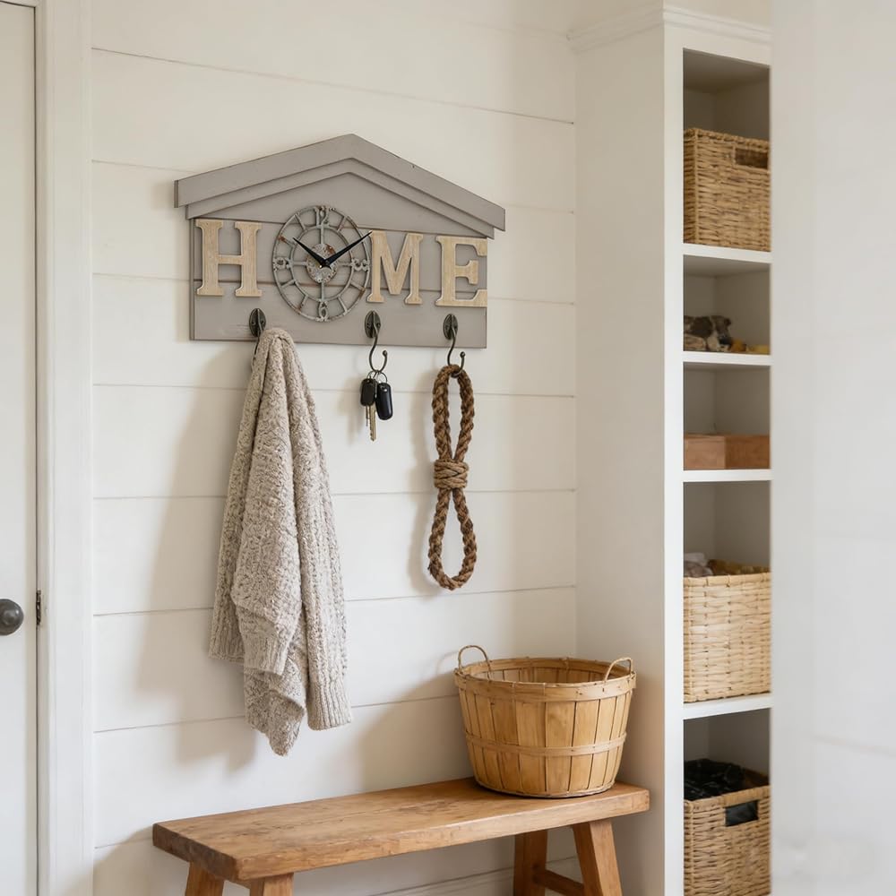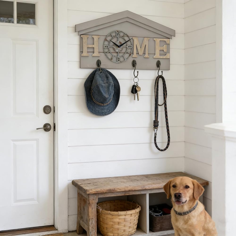 ساعة حائط تعمل بالبطارية في المزرعة مع خطافات منظم مدخل خشبي ريفي مع 3 خطافات معدنية شماعة مفاتيح وحروف منزلية ساعة كوارتز صامتة حامل مفاتيح ديكور حائط لمدخل المطبخ وغرفة المعيشة