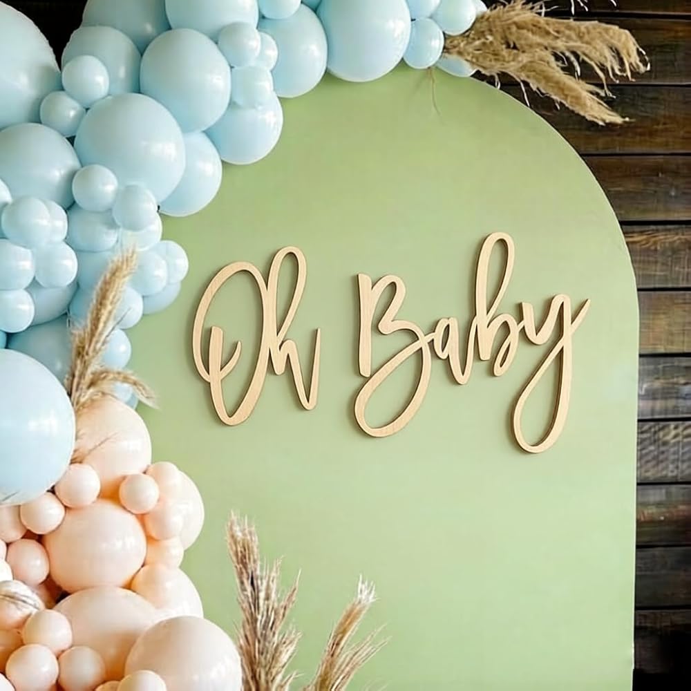 Add an elegant touch to your special celebration with this charming 'Oh Baby' decorative sign. Perfect for baby showers, gender reveal parties, birthdays, or as a stunning photo backdrop, this wooden script lettering creates an eye-catching focal point for your event decor. The flowing cursive design features a beautiful champagne-colored finish that adds sophistication to any setting. This versatile wall art can be mounted on various surfaces to create the perfect photo opportunity or statement piece. The lightweight yet durable construction makes it easy to position and transport. Whether displayed on a dessert table, hung on a wall, or incorporated into a larger decorative arrangement, this stylish sign will help create lasting memories of your joyous occasion. Makes a wonderful keepsake that can later be used as nursery decor. Please note that mounting hardware and instructions for installation should be reviewed before use.