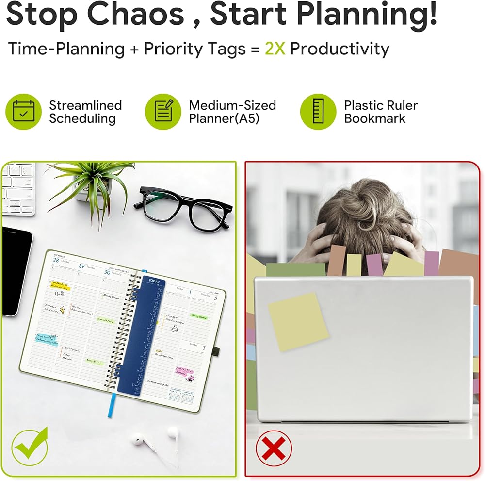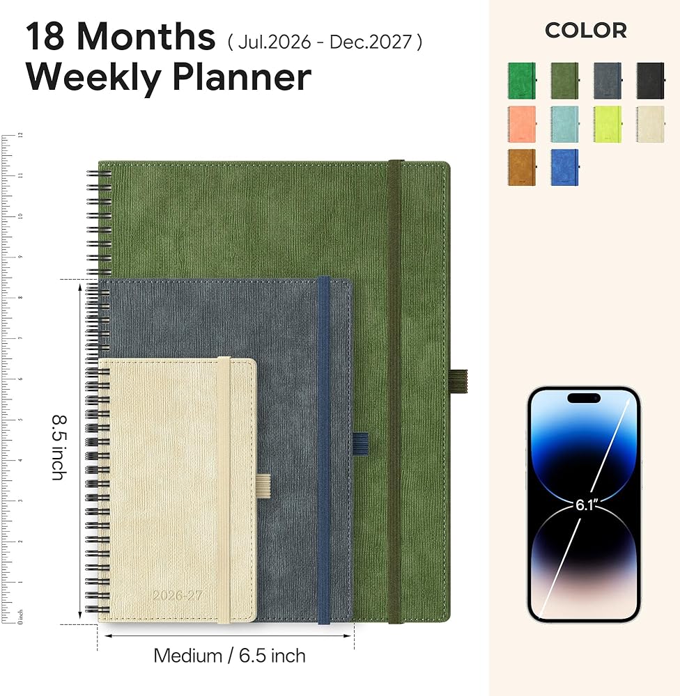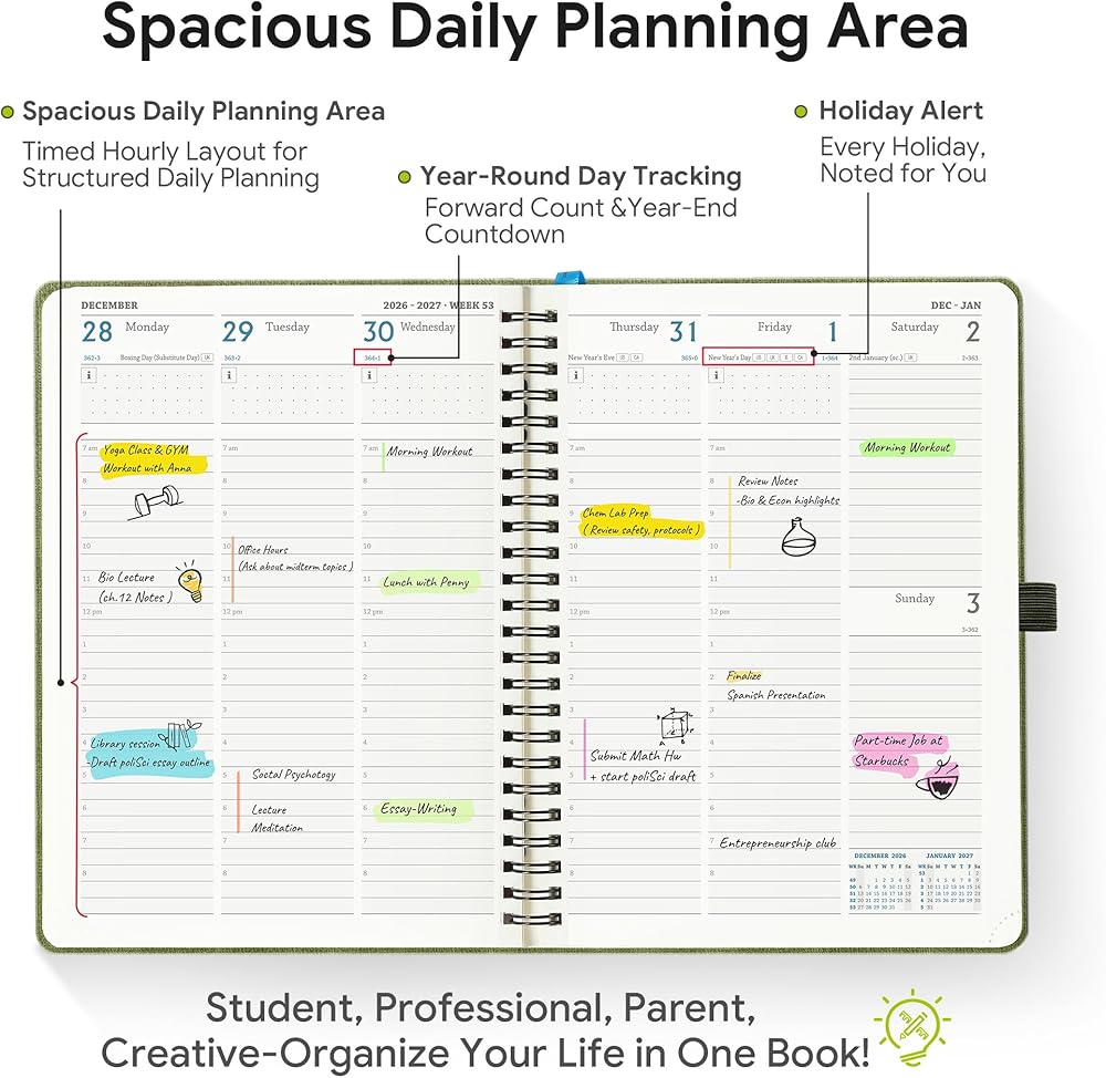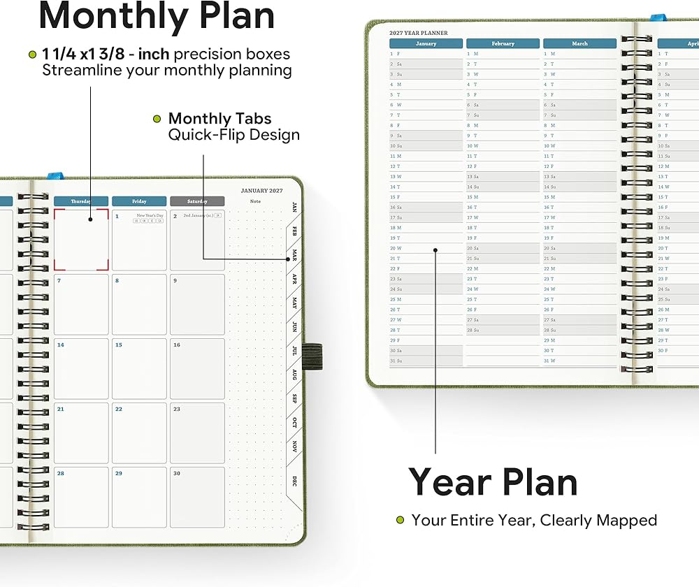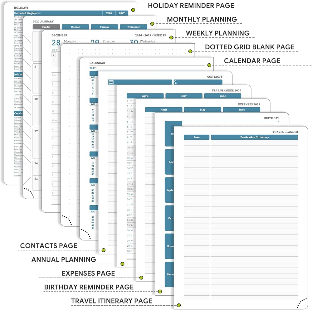 التخطيط الرأسي للمخطط الشهري: يغطي يوليو 2026 إلى ديسمبر 2027. إنها تعتمد تصميم صفحة مزدوجة لمدة أسبوع واحد، حتى تتمكن من الحصول على نظرة عامة دون قلب الصفحات. توفر صفحة المخطط الأسبوعي مساحة للكتابة لترتيب المهام اليومية وإدارة الأولويات وسجلات الأنشطة؛ يشير الجانب الأيسر من الخطة الشهرية إلى تواريخ مهمة، ويخطط الجانب الأيمن للمهام الخاصة