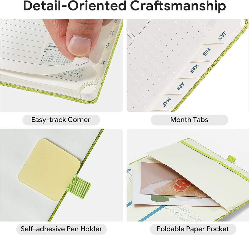 مادة رائعة للمخطط الأسبوعي: مصنوع من ورق سميك FSC-80gsm يقاوم نزيف الحبر والتآكل اليومي، يضمن مخطط 2026-2027 كتابة سلسة باستخدام الأقلام بينما يكون لطيفًا على عينيك من خلال صفحاته البيضاء العاجية. الغطاء الناعم المصنوع من الجلد النباتي والرباط المسطح المقوى يجعله رفيقًا لمخطط التقويم للمحترفين المشغولين والطلاب والعائلات.