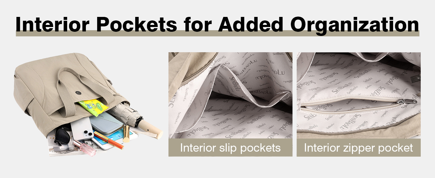 جيوب متعددة: تحتوي حقيبة العمل على 6 جيوب منفصلة: حجرة رئيسية كبيرة يمكنها بسهولة حمل مجلد A4 والملابس وغيرها من الضروريات اليومية. 1 جيب أمامي بسحاب + 2 جيب خارجي مفيد + 1 جيب داخلي بسحاب + 2 جيب داخلي سريع منزلق يسمح لك بالوصول إلى العناصر بسهولة