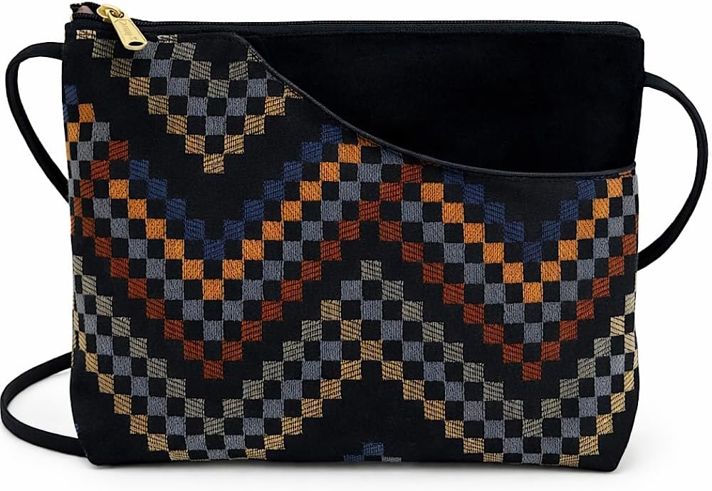 Our handmade women's handbags are proudly made in the USA from gorgeous, hand-cut tapestry fabrics and water-resistant nylon lining, interfacing throughout, edge-binding on all exposed seams, woven nylon straps, YKK zippers, and heavy-duty nylon thread Stylish and comfortable with a clever nylon microfiber cord that adjusts from the inside; adjustable from 10” to 58” to be worn as a Clutch, Shoulder Bag, or Crossbody Purse Zipper Purse is a perfect little size, great for day or night, measuring 10" wide x 7" high x 2½" deep. The cutaway front pockets will hold a cell phone and a bottle of water Top zipper closure keeps wallet and personal items secure, an inside zipper pocket can hold keys and valuables, and full-length zip pocket on the front All bags have black strap and trim with gold hardware