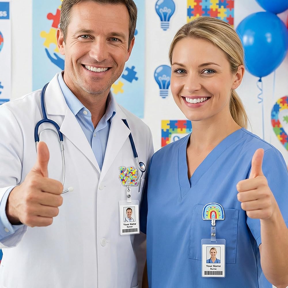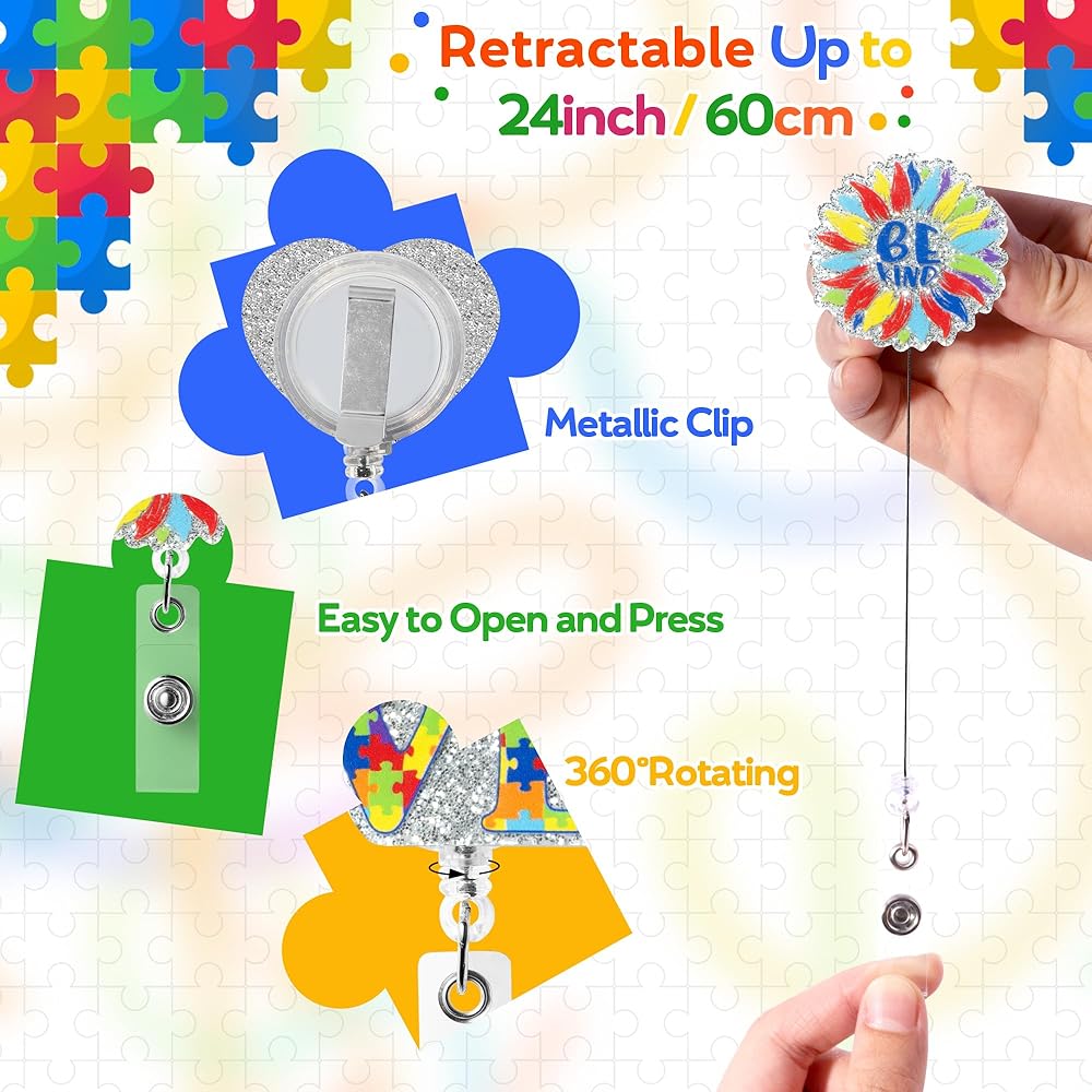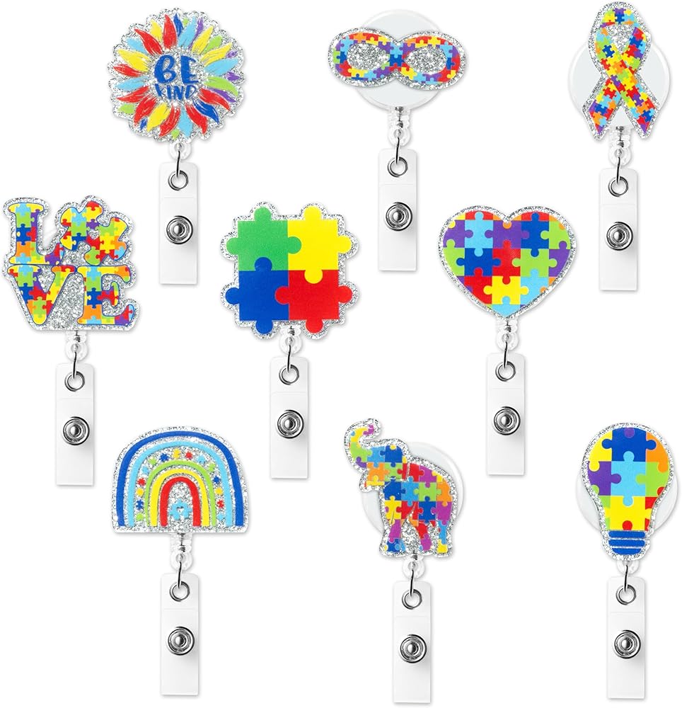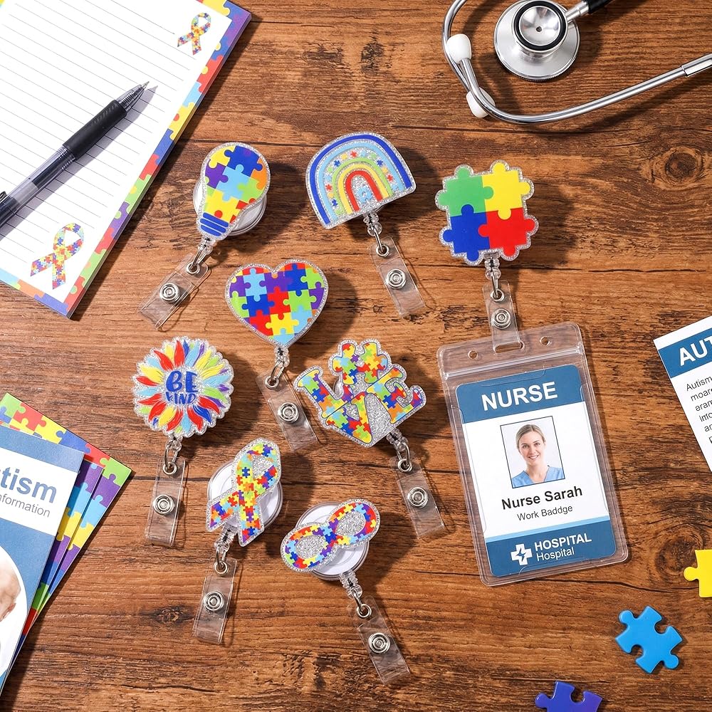 9 قطع بكرة شارة شهر الوعي بالتوحد، لغز لامع من الأكريليك قابل للسحب، مشبك شارة التمريض، قوس قزح Be Kind، بطاقة الهوية، حامل بطاقة الهوية، ملحقات مشبك التمساح المكتبي لطلاب الطبيب والممرضات