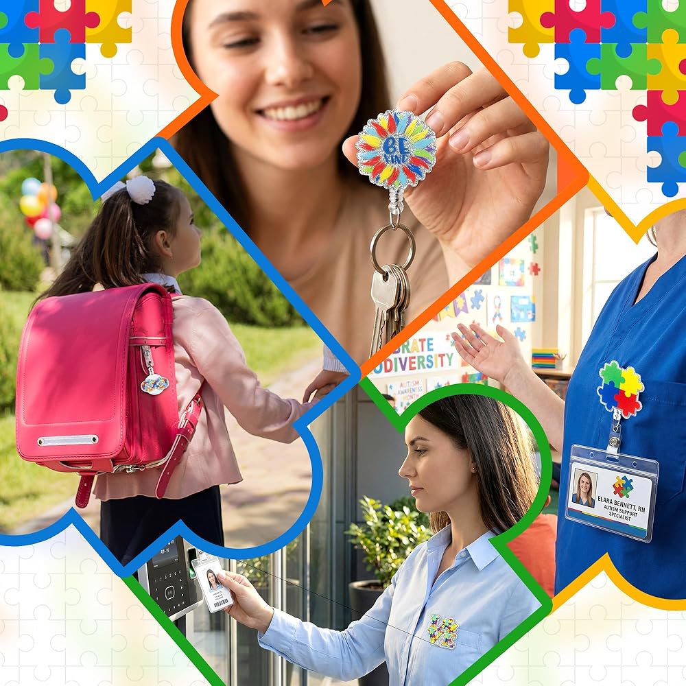 • تصميم للتوعية بمرض التوحد: قطع ألغاز لامعة، وأنماط قوس قزح، وزخارف قلب مع رسائل راقية مثل "كن لطيفًا". يعبر كل تصميم من الأكريليك عن الحب والدعم لمجتمع التوحد، مما يجعله أكثر من مجرد حامل لبطاقة الهوية - رمز للشمول والتشجيع.