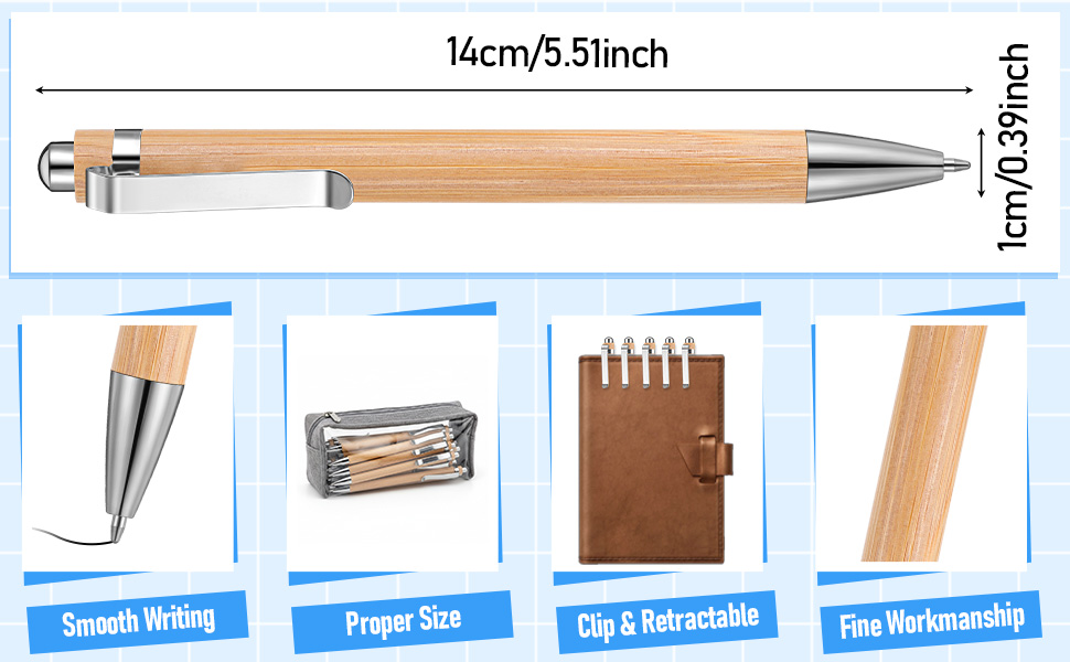هيكل من الخيزران الطبيعي: أقلام الخيزران مصنوعة من الخيزران الطبيعي، مما يمنحها رائحة خشبية منعشة. تتميز أقلام الحبر الخشبية القابلة للسحب هذه بالقوة والمتانة، مع سطح أملس وصناعة متقنة، وليس من السهل أن تنكسر أو تتلاشى، وسوف تخدمك لفترة طويلة.