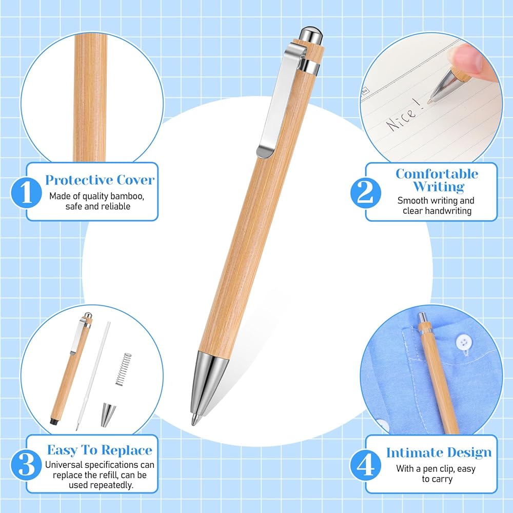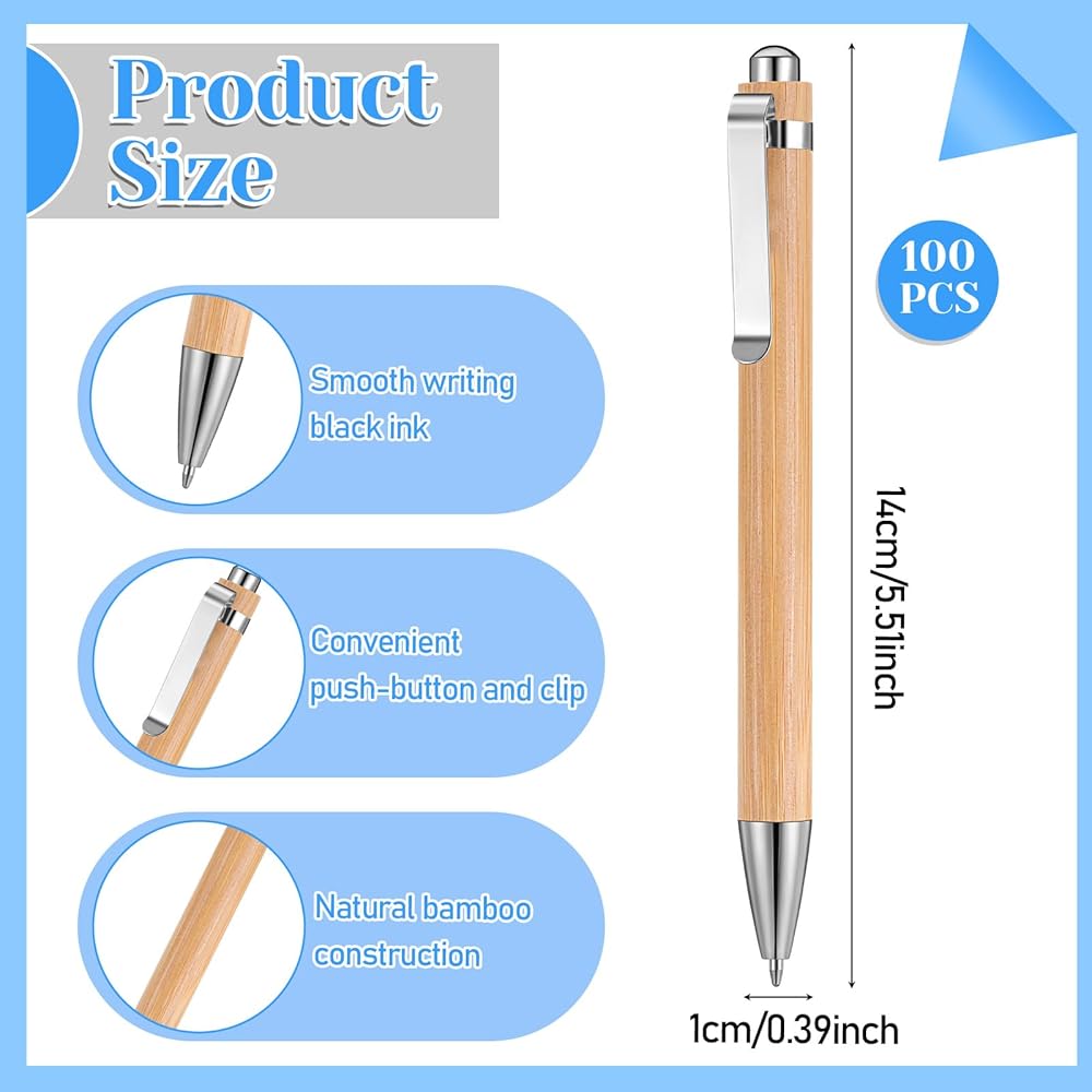 كمية مرضية: سوف تحصل على 100 قطعة من أقلام حبر جاف الخيزران القابلة للسحب، كمية كافية يمكن أن تلبي احتياجاتك في الاستخدام والاستبدال. تعتبر أقلام الخيزران هذه مثالية للاستخدام الشخصي ويمكن أيضًا تقديمها كهدايا لأفراد الأسرة أو الزملاء أو استخدامها كهدايا صغيرة للمناسبات الصفية.