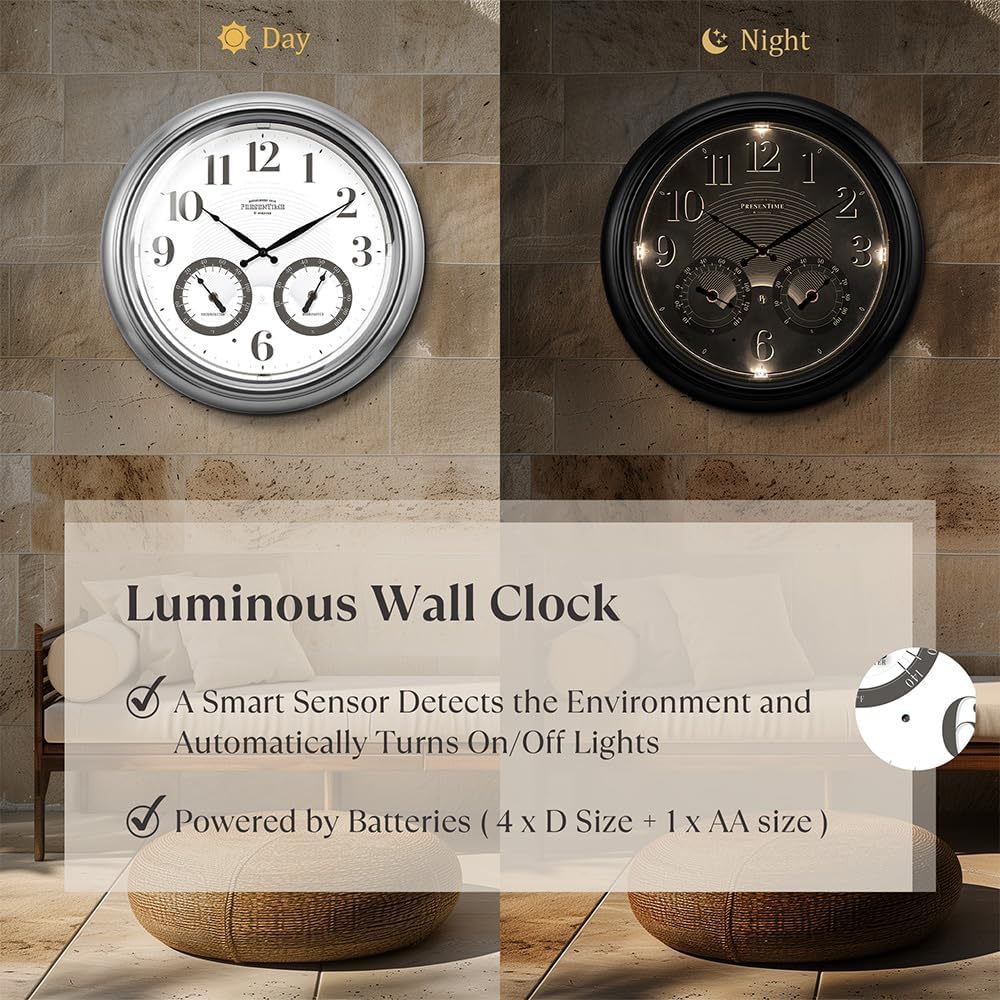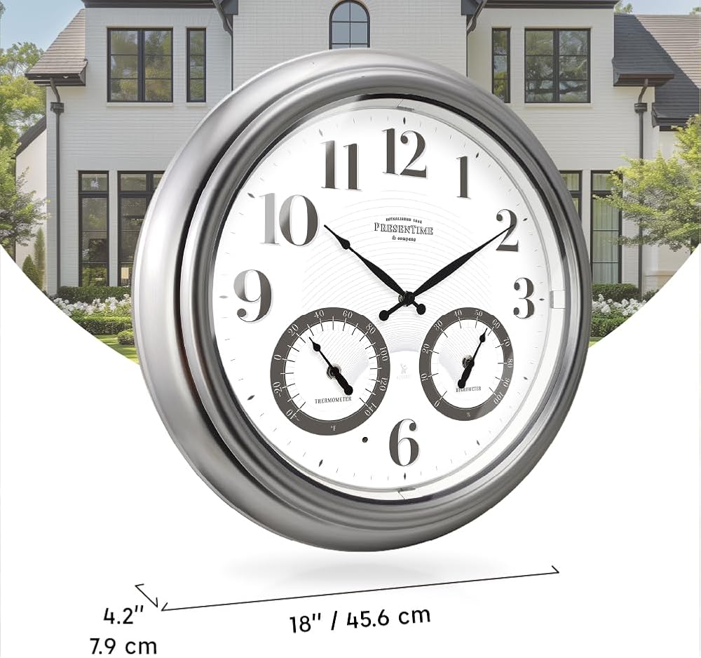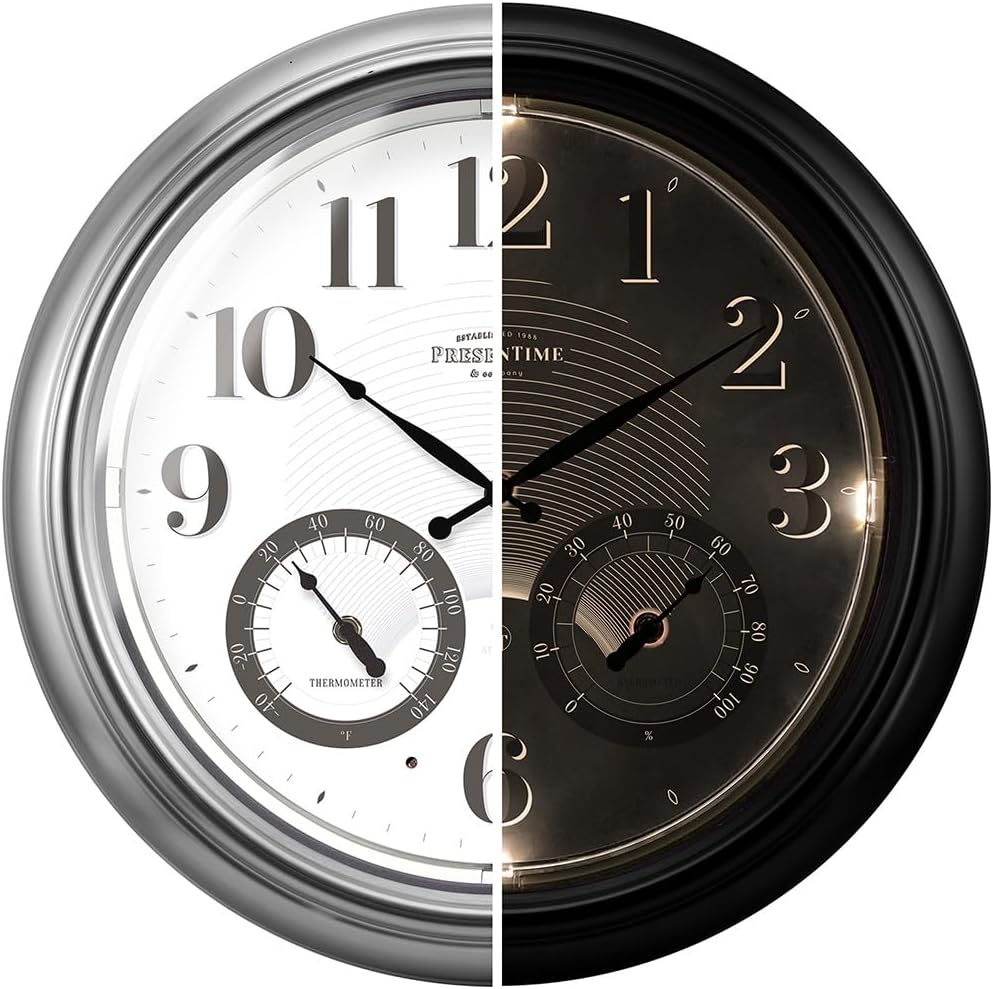 ساعة ذرية مضيئة للداخل/الخارج مقاس 18 بوصة من Presentime & Co مع مستشعر ذكي وإضاءة ليلية، مقاومة للماء، ساعة حائط كبيرة مع مقياس حرارة ومقياس رطوبة، للحديقة والفناء، فضي.