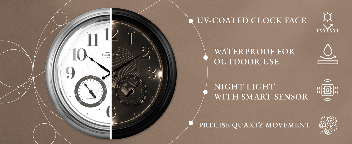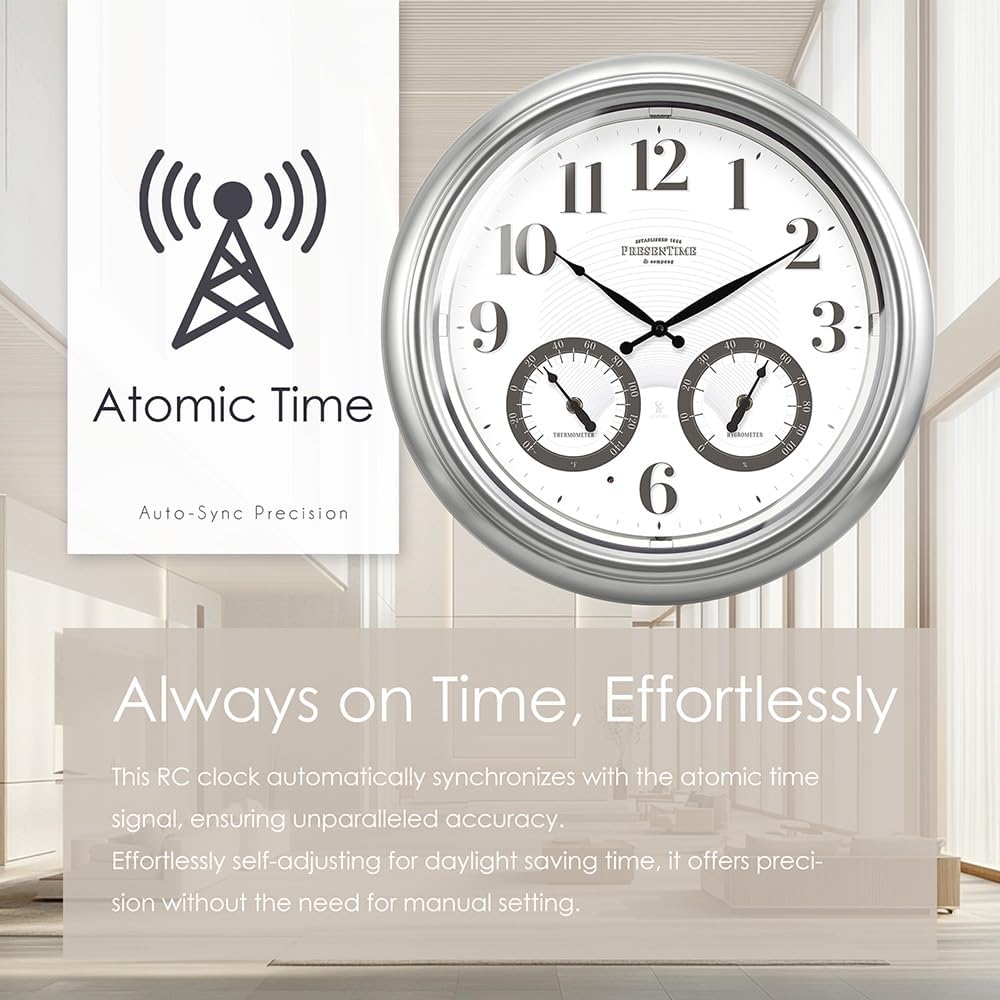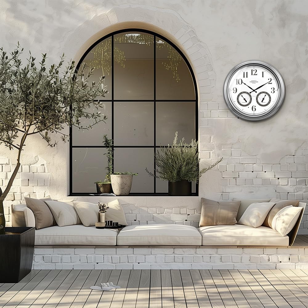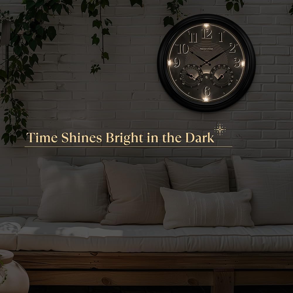 ساعة ذرية مضيئة للداخل/الخارج مقاس 18 بوصة من Presentime & Co مع مستشعر ذكي وإضاءة ليلية، مقاومة للماء، ساعة حائط كبيرة مع مقياس حرارة ومقياس رطوبة، للحديقة والفناء، فضي.