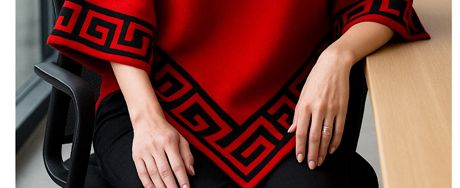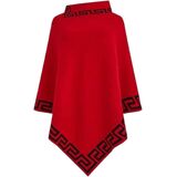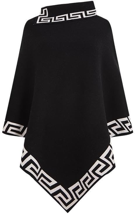 Make a bold style statement with this sophisticated poncho-style sweater featuring an iconic Greek key pattern. The elegant design showcases a high neck for warmth and sophistication, while the asymmetric hemline adds a contemporary twist to this timeless piece. Available in classic black, striking red, or versatile brown, this pullover blouse combines comfort with catwalk-worthy style. The distinctive geometric border pattern adorns the neck, sleeves, and hem, creating a luxurious frame that elevates this piece from simple to stunning. The flowing silhouette drapes beautifully and offers versatile styling options for both casual and dressy occasions. Perfect for layering during cooler seasons, this knitted sweater seamlessly blends Western fashion sensibilities with classical design elements. The generous cut ensures comfortable movement while maintaining an elegant profile, making it an ideal choice for various body types and occasions.