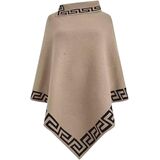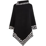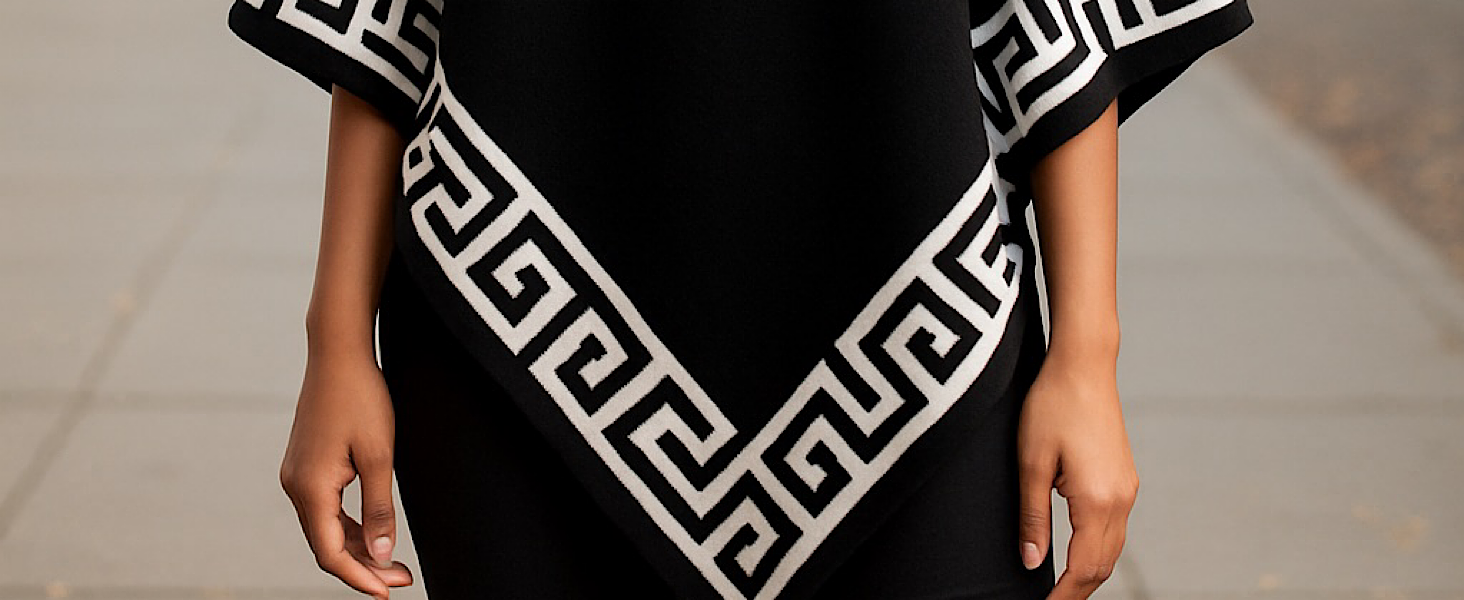 • DESIGN FEATURES: High-neck poncho with distinctive Greek key pattern trim along neckline, sleeves, and asymmetrical hem for elegant styling