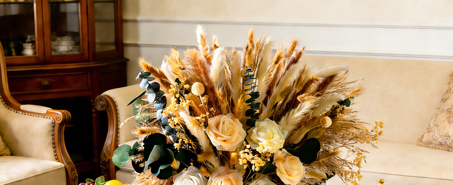 • جمال يدوم طويلاً: على عكس الزهور الطازجة، تحافظ هذه الزهور الصناعية المجففة والعشب على مظهرها بمرور الوقت، ولا تحتاج إلى ماء أو عناية خاصة، وهي خيار مثالي لفترة طويلة.