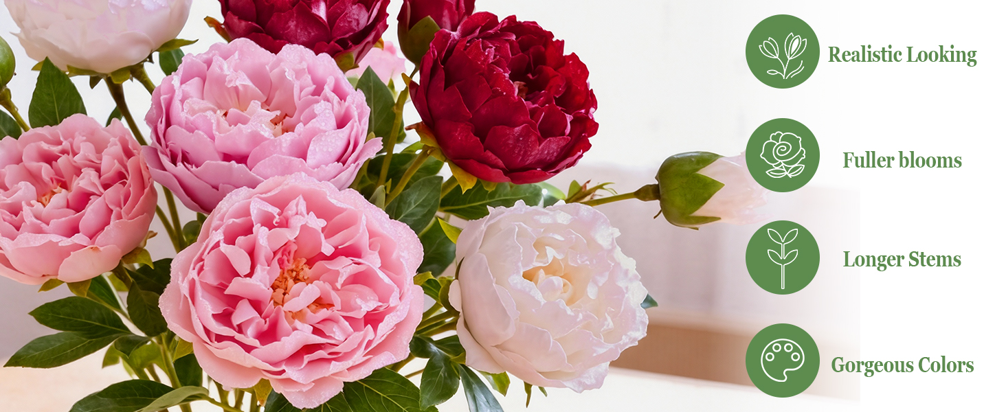【ألوان نابضة بالحياة وأنيقة】تتميز زهور الفاوانيا ذات الملمس الحقيقي بألوان نابضة بالحياة ولافتة للنظر، والتي يمكنها رسم التركيز البصري للمساحة على الفور. سواء كان اللون الوردي الفاتح اللطيف والأنيق، أو الأبيض النقي والكلاسيكي، أو الأرجواني الشاحب الرقيق والرومانسي، أو الأحمر النبيذي العميق والغني، يمكنها جميعًا جلب الحيوية وإنشاء ربيع أبدي. ألوانها لا تبهت أبدًا، مما يغمر أي مساحة بالعطر الأبدي وإشراق الزهور.