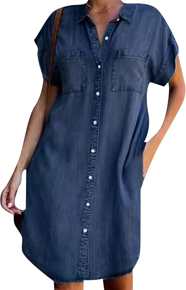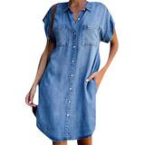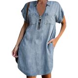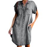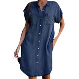 فستان نسائي صيفي قصير من قماش الدنيم، فساتين كاجوال بأكمام قصيرة، رقبة على شكل حرف V، سترة فضفاضة، ياقة على شكل طية صدر السترة، فساتين قميص أنيقة مع جيوب