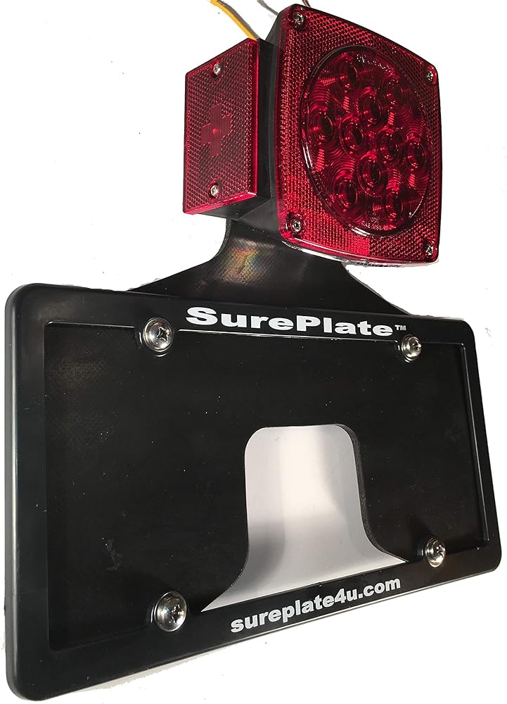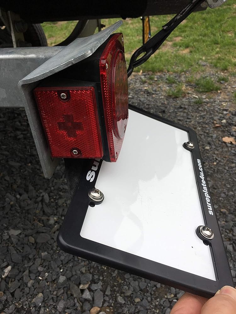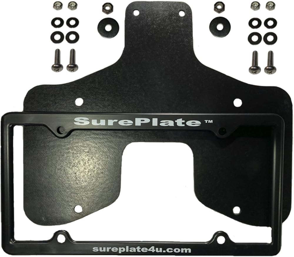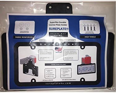 The SurePlate DM16004 (Deluxe-Max, Frame) is our premium product that includes: 1. (1X) 6 hole neoprene rubber license plate holder (11.81 x 9.87 x .19 inches). 2. (1X) Standard sized plastic license plate frame (12.375 x 6.375 x .250 inches). 3. (6X) SS Locknut-Hex, Nylon-Insert, 0.250-20, 0.4375 W, .3125 H inches. 4. (4X) SS Washer-Flat, 0.250 ID X 0.625 OD inches. 5. (2X) SS Washer-Flat, 0.250 ID X 0.875 OD inches. 6. (4X) SS Screw-Pan Hd, Phillips #3, 0.250-20, 0.750 L inches. This product provides protection to all four edges of your license plate. Lamp assembly not included. SurePlate(TM) products prevent loss of your trailer license plate. This product keeps your license plate securely fastened to standard left side DOT brake/tail lamp assembly with integrated light. The product simply mounts between existing trailer tail light mounting bracket and existing lamp assembly. This product was designed for Boat, PWC, Snowmobile, ATV, and Utility trailers. The product is durable, flexible, and water proof to prevent corrosion and ensures long lasting security for your license plate. This product is made from premium tough, high tensile, multiply fabric reinforced 0.1875 inch thick neoprene rubber. The product is sufficiently rigid to properly present the license plate while moving and flexible enough to prevent damage during accidental encounter with minor obstructions. SurePlate(TM) products were designed to provide longevity. Do not over tighten fasteners, damage to rubber may occur. You get what you pay for. What is the value of cheap when the competitors are producing metal products that corrode and plastic products that fatigue fail? Our customers know that SurePlate(TM) products are well worth the cost to prevent time and money spent on obtaining a lost plate police report and a subsequent trip to DMV. Isn't preventative action and the cost of SurePlate(TM) products worth 2 hours of your time plus DMV fees? Made in USA. Patent No. 9,586,538.