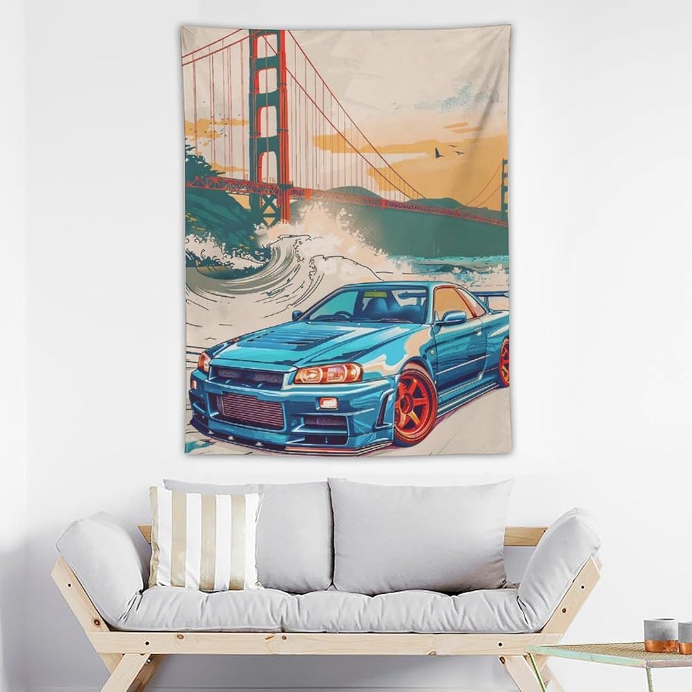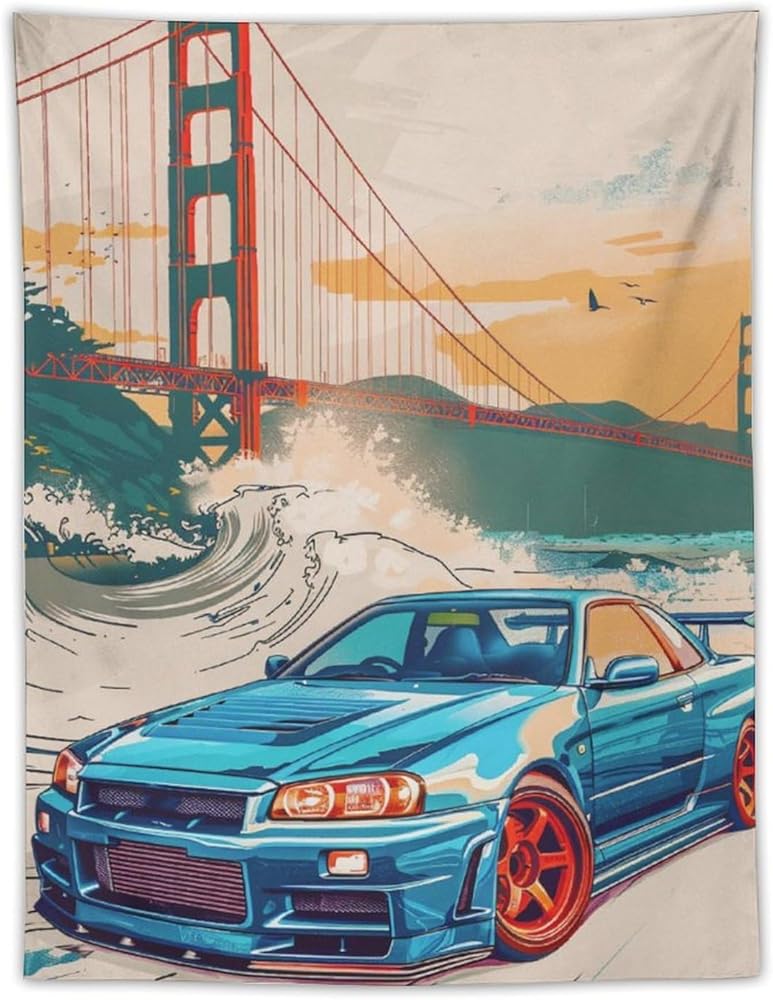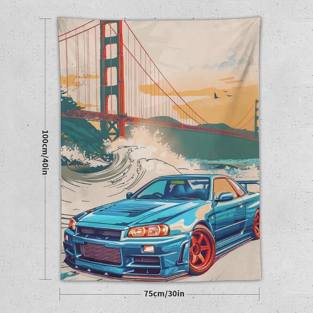 qeopgne سيارة كبيرة نسيج الجدار شنقا ديكور جسر البوابة الذهبية موجات كبيرة اليابانية الرجعية jdm سيارة r34 نسيج لغرفة المعيشة جدار ديكور كبير جدار الفن المفروشات 30 "x40"