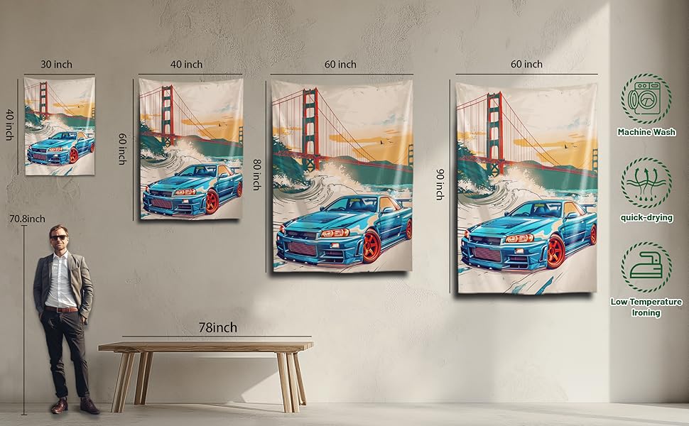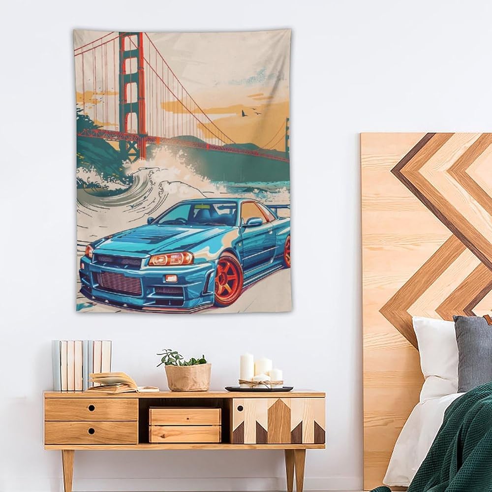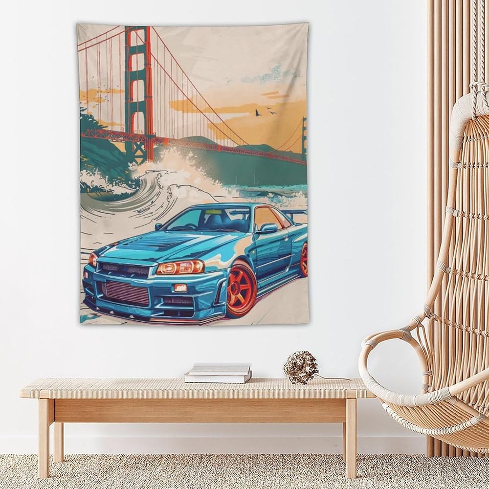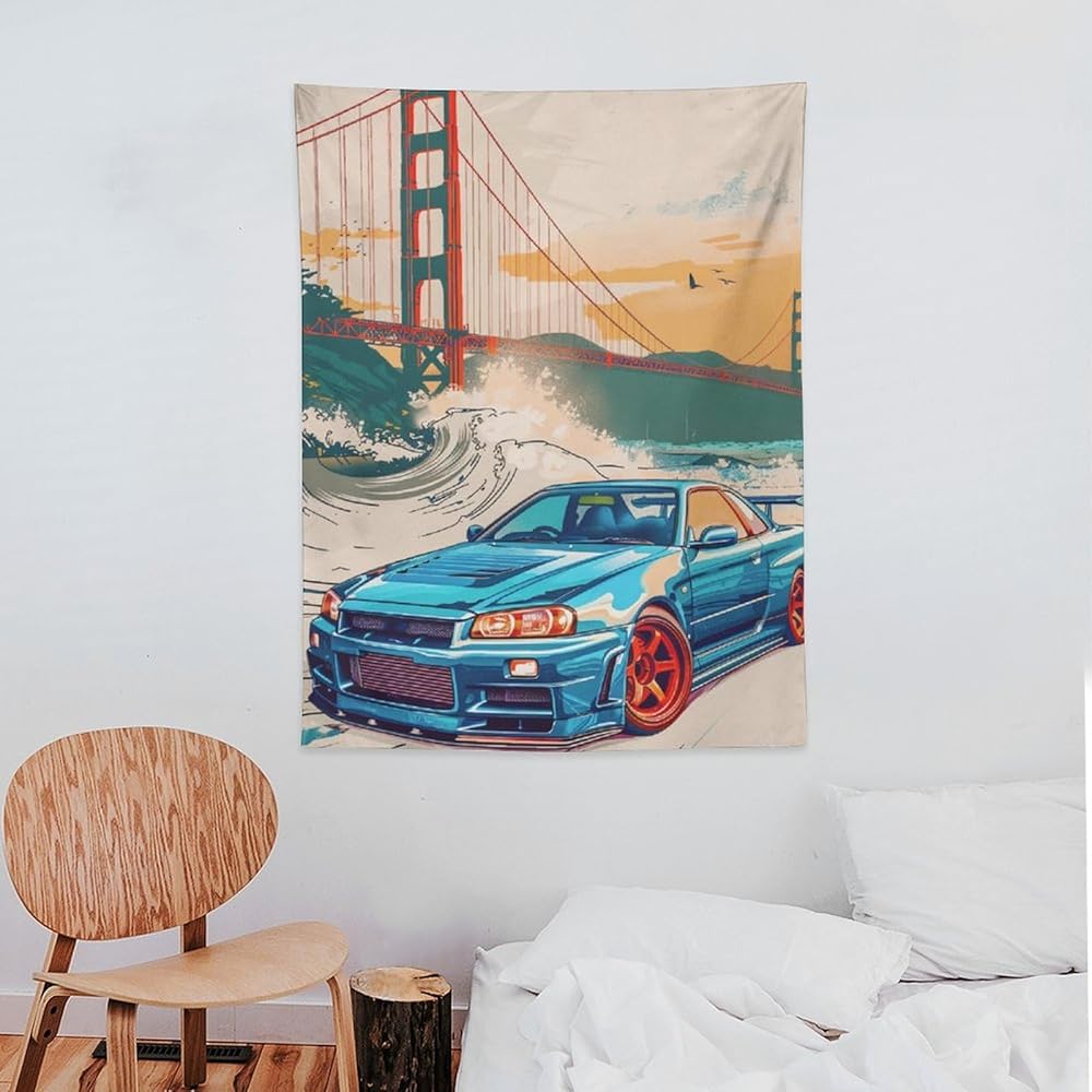 qeopgne سيارة كبيرة نسيج الجدار شنقا ديكور جسر البوابة الذهبية موجات كبيرة اليابانية الرجعية jdm سيارة r34 نسيج لغرفة المعيشة جدار ديكور كبير جدار الفن المفروشات 30 "x40"