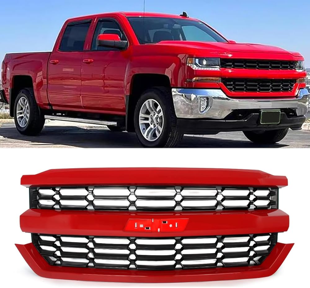 Honeycomb Front Grill Grille Compatible with 2016 2017 2018 Chevy Silverado 1500 LS Model Pickup Red Hot+Black Painted Front Bumper Grilles Cover Replace for 84374385, 84602489, 84056776