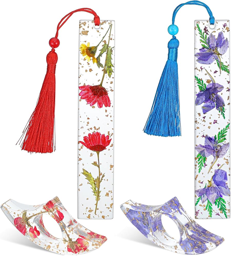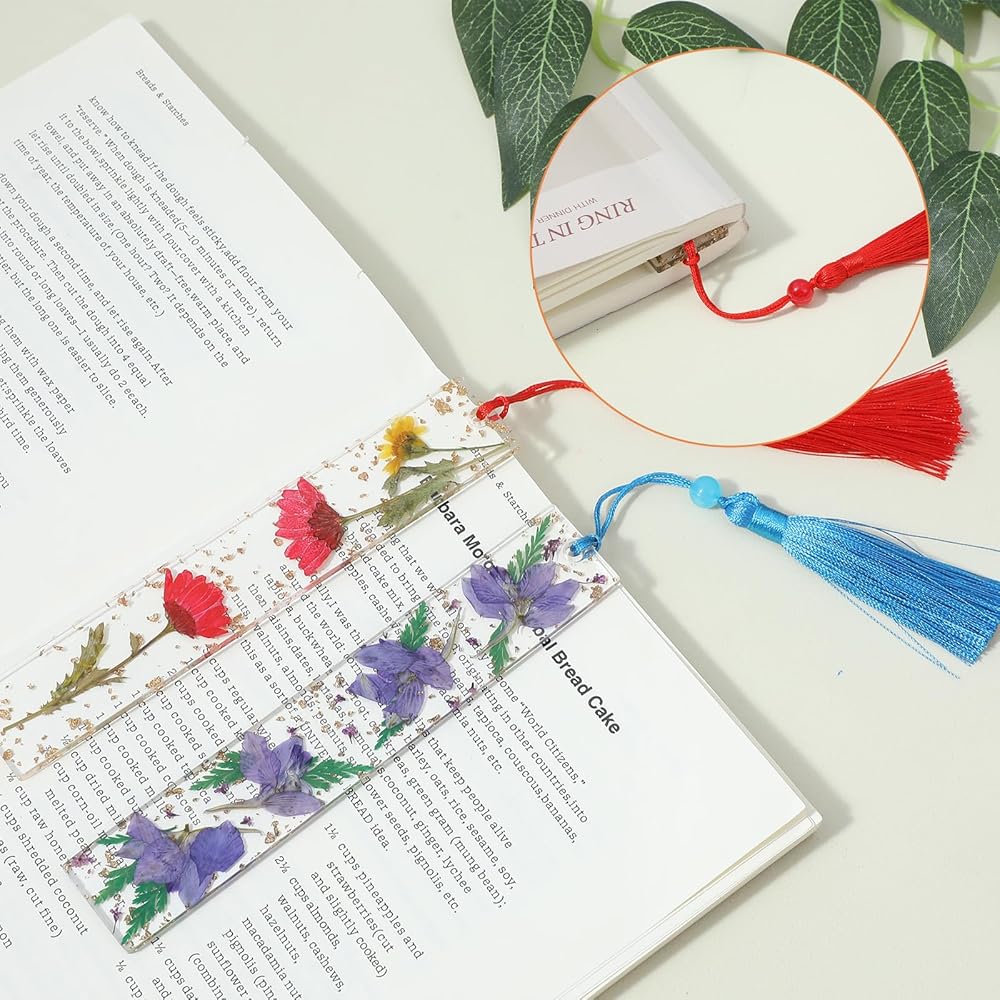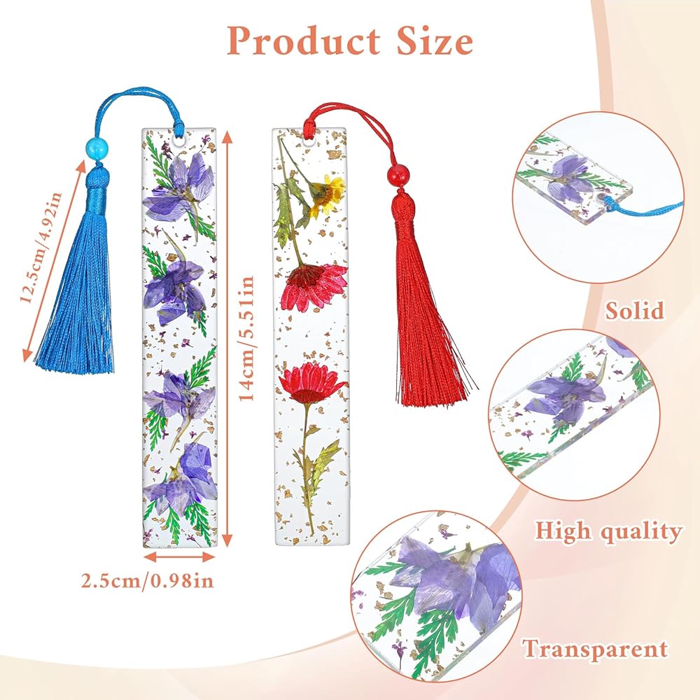 Package Contents: 4PCS Transparent Dried Flower Resin Bookmarks (2 bookmarks + 2 book stoppers in red & blue)