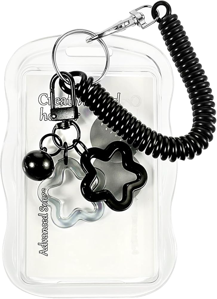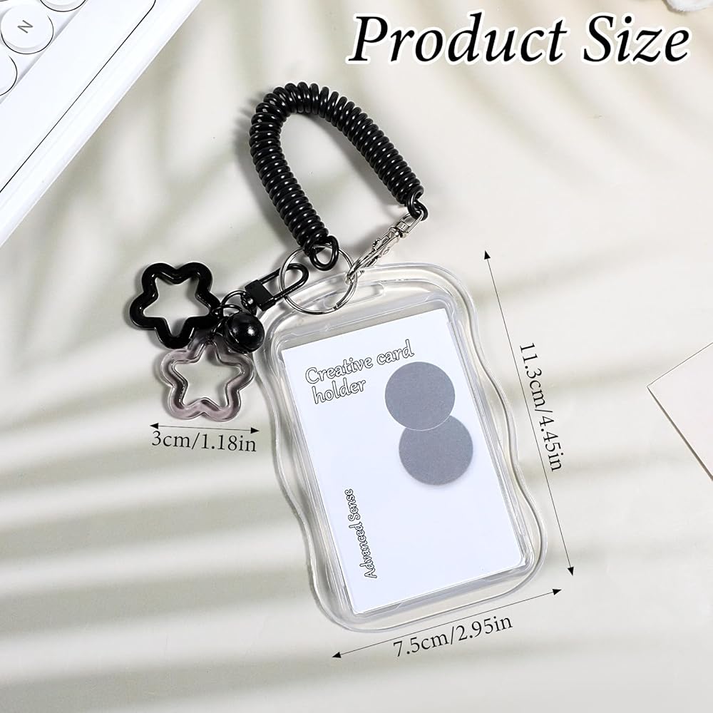 سلسلة مفاتيح حامل بطاقات الصور، حامل بطاقات صور لطيف مع قلادة على شكل جرس على شكل نجمة وحبل زنبركي شفاف وحاملات بطاقات صور إبداعية لهوية الطالب وممر الحافلة وشارة معرف الصور (أسود)