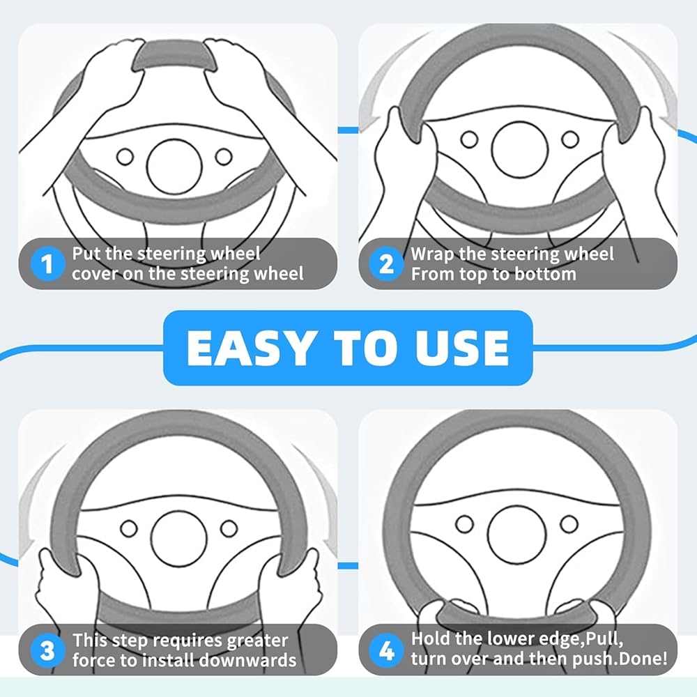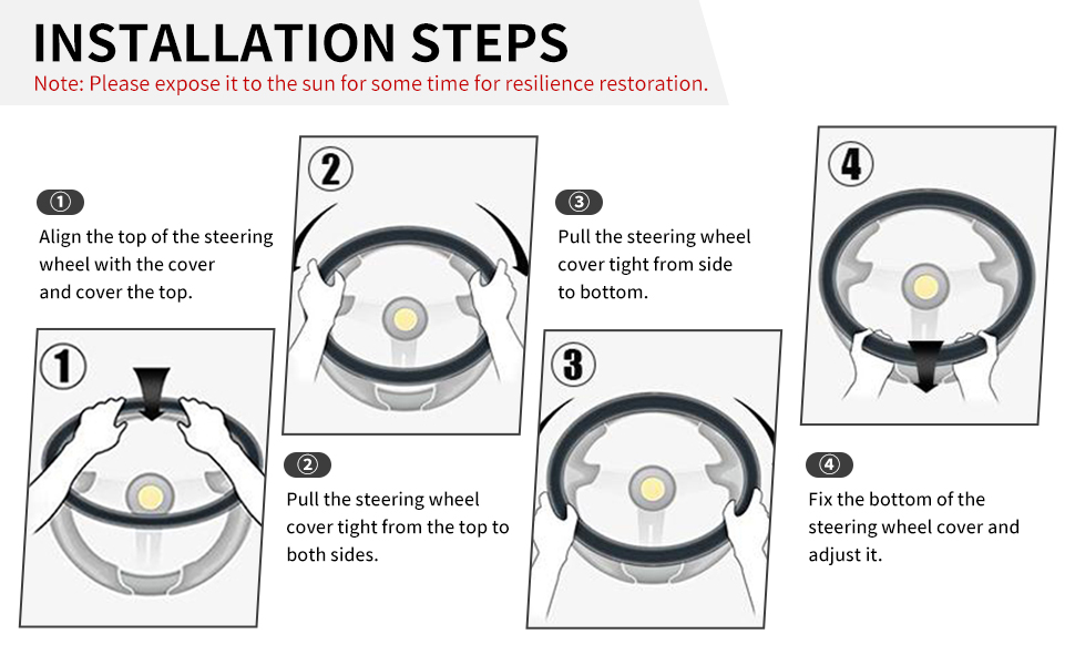 سهولة التركيب: يمكن تركيب الغطاء بسهولة على معظم عجلات القيادة ذات الحجم القياسي، كما يسمح التصميم سهل الارتداء بالتركيب السريع والخالي من المتاعب دون الحاجة إلى أي أدوات. فقط ضع الغطاء أعلى عجلة القيادة. اضغط مع الاستمرار على الجزء العلوي من الغطاء وقم بخفضه تدريجيًا بكلتا يديك على كلا الجانبين لإحكام ربطه. ملاحظة: بعد تثبيت غطاء عجلة القيادة هذا، ستظل وظيفة تسخين عجلة القيادة تعمل، فقط مع نقل الحرارة بشكل أبطأ قليلاً.