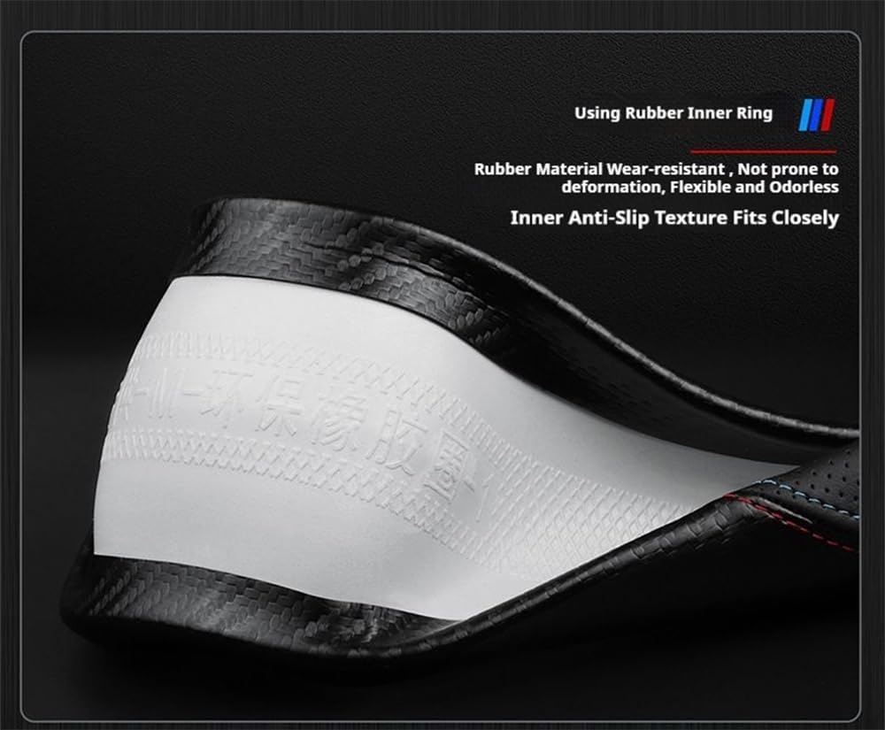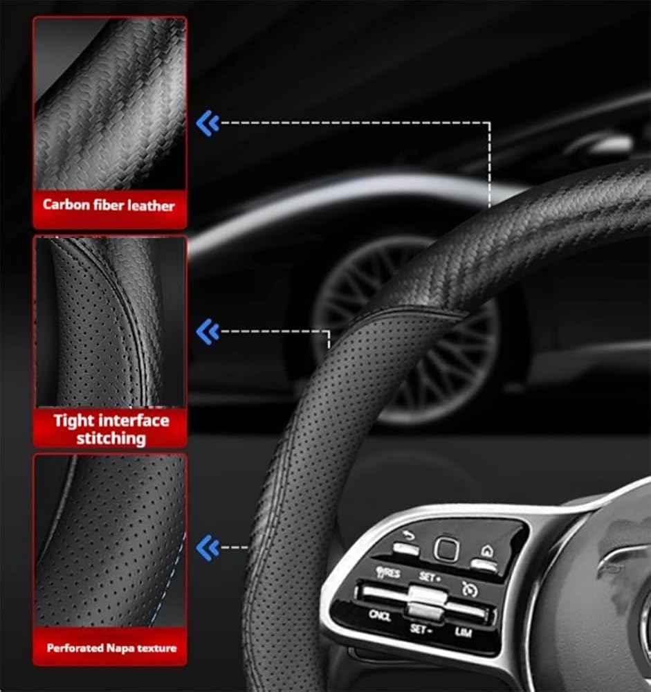 قبضة مضادة للانزلاق: مصنوعة من ألياف الكربون المصنوعة من جلد نابا الناعم المتين عالي الجودة والمواد المطاطية لمنع الانزلاق، وتوفر قبضة مريحة وآمنة لتعزيز التحكم في القيادة. وجلد نابا متين وصديق للبيئة وصحي ويمتص العرق وجيد التهوية، مما يسمح لك بالقيادة بشكل مريح.