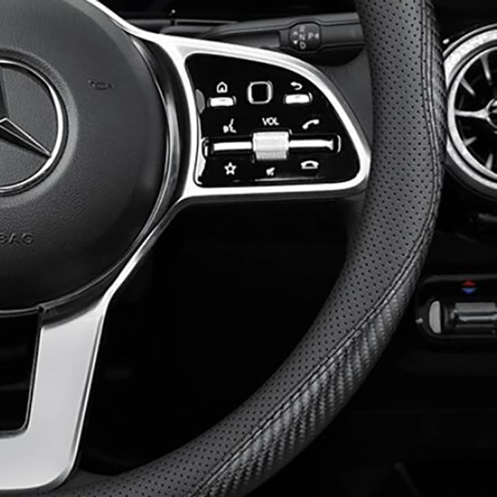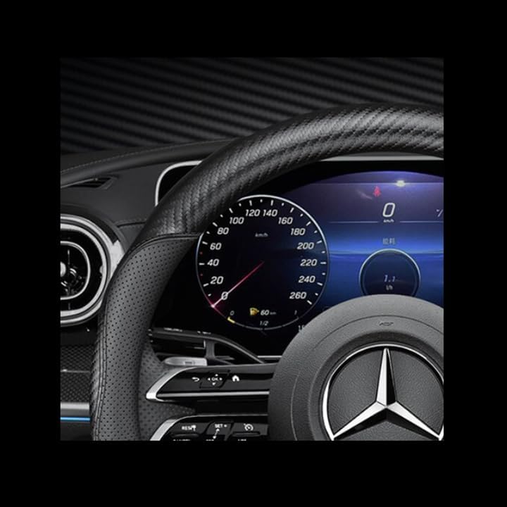 تصميم فريد: غطاء عجلة القيادة من ألياف الكربون الأسود مع تصميم خياطة خط أسود، إنه ناعم ومتين مع لمسة مسامية. يمنحك تجربة بصرية أفضل، يضيف تصميم الربط الدقيق نسيجًا إلى الجزء الداخلي من سيارتك. أضف أيضًا إحساسًا بالموضة إلى داخل السيارة!
