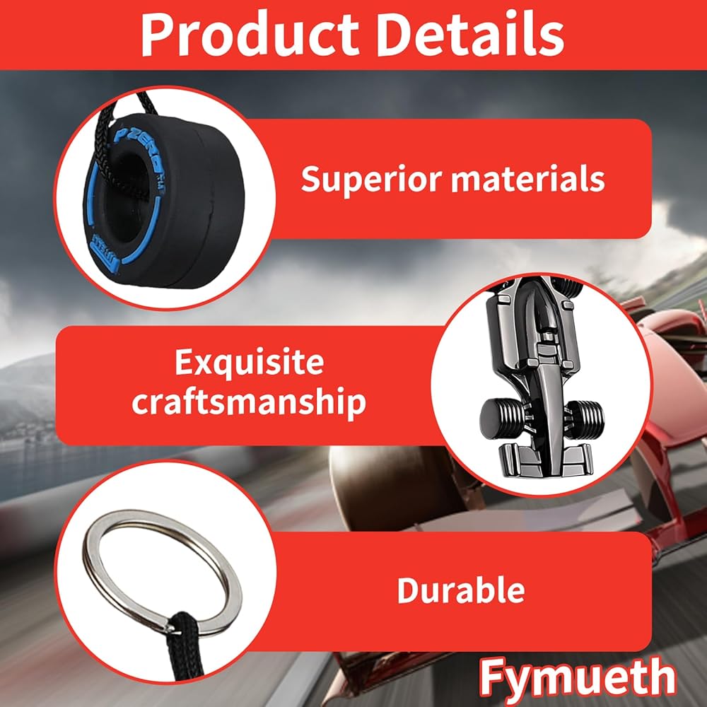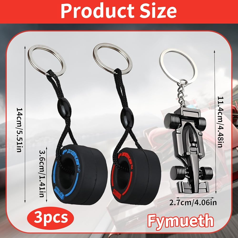 Three Piece Set: Includes one black racing model keychain and two racing tire keychains; Versatile collection for gifting to Formula 1 fans or adding to racing themed displays; Compact size perfect for desktop arrangement or personal carry