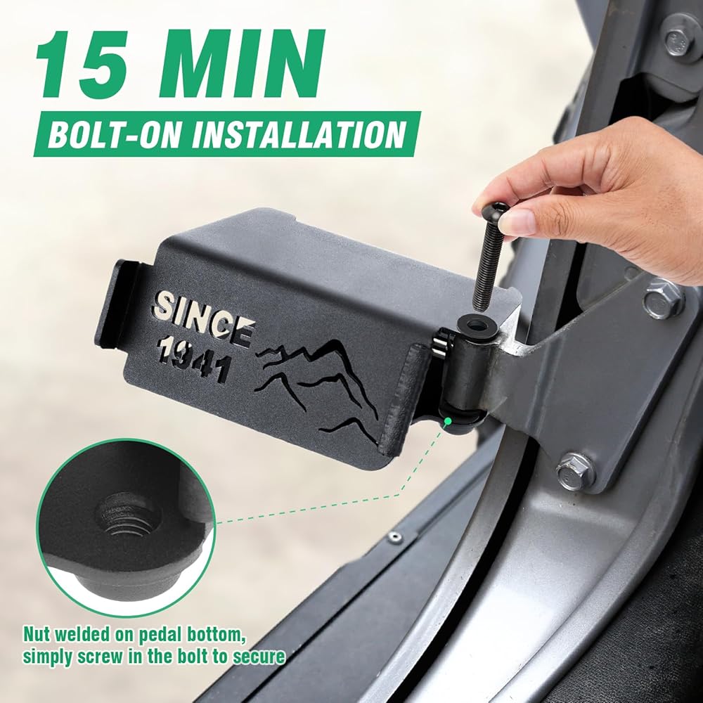 • 【QUICK INSTALLATION】Jeep Foot Pegs bolt directly to door hinges - no drilling/welding! Perfect jeep gladiator accessories for doorless adventures. Includes full installation guide.