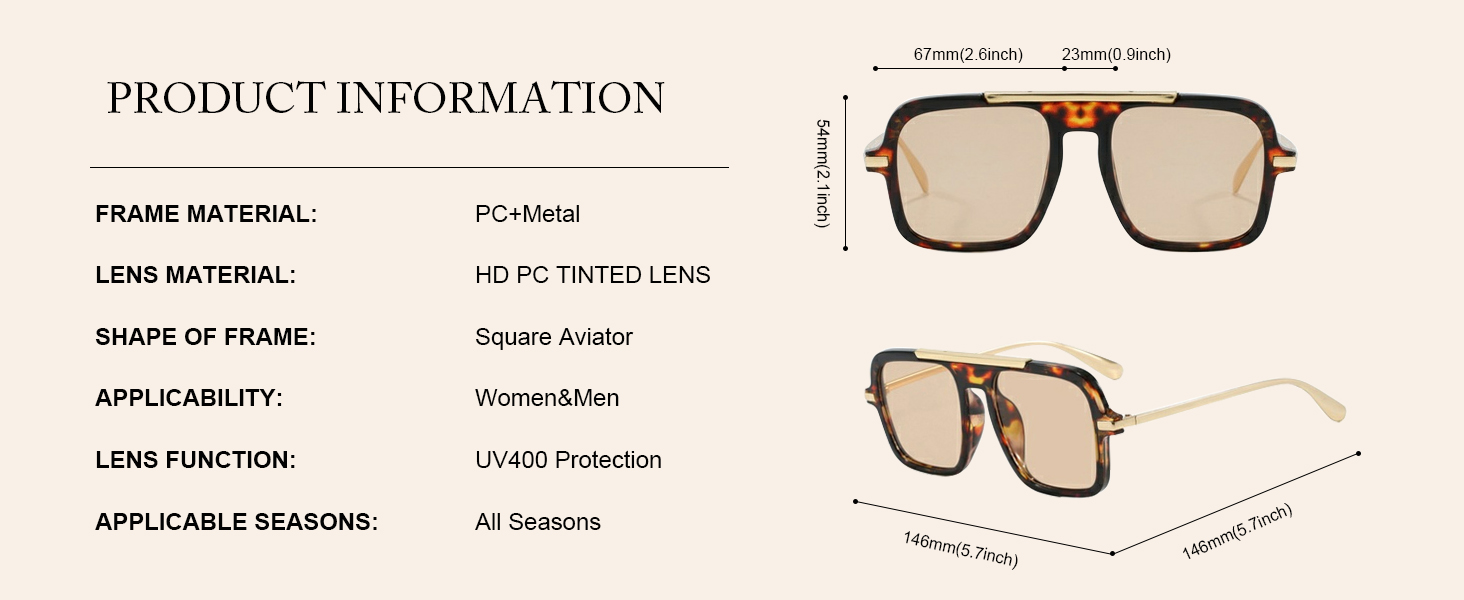 Women Aviator Sunglasses Measurements and Package: Lens Width: 67mm(2.6 inches) | Lens Height: 54mm (2.1 inches) | Temple Length: 146mm(5.75 inches) | Nose Bridge: 23mm(0.91 inches).Weight: 35g (0.077 lb),Frame Width Type: Oversize-Big-Large,Suits Oval, Round, Square,Heart Face Shape.you will receive square Aviator sunglasses green glasses*1,soft drawstring pouch*1 (can be used for glasses cleaning cloth also) ,sunnies box*1,making it a wonderful yet practical gift idea for friends and family!