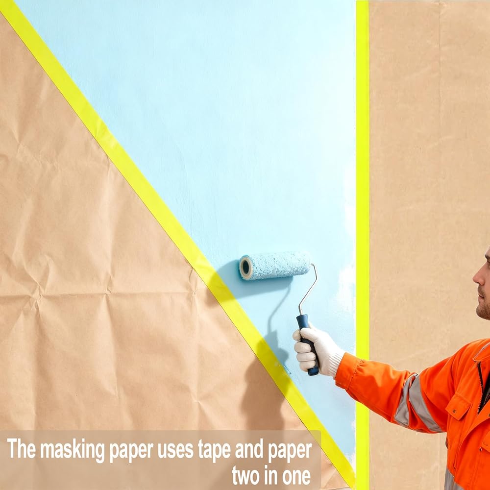 Masking Tape & Paper 2 in 1: This pretaped masking paper features with premium masking paper and painter tape together, cover and secure with one action, quick and easy protection for most surfaces, saving your time in painting.